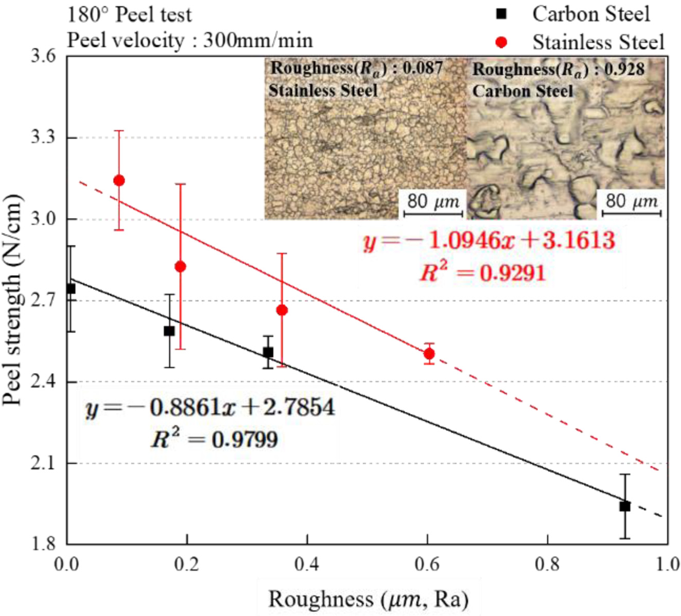 조도에 대한 박리특성 평가. 스테인리스강에서 감압 접착제의 박리강도는 탄소강에서의 박리강도보다 더 높게 관찰되었다(Figure 5). 이 실험은 비교적 단시간(≤1시간/회) 동안의 박리시험이기 때문에 감압 접착제가 대상 기판과 화학결합(Chemical bonding)을 하지 않고, 반데르발스 힘(van der Waals force)에 의한 물리적인 영향인 더 크게 작용한 것으로 판단된다. 이 때 조도의 차이는 대상 기판의 종류보다 물리적인 영향력이 더 크기 때문에, 대상 기판의 표면 조도에 대한 평가는 반드시 필요하다. Figure 9는 대상 기판의 조도(substrate roughness, Ra(μm))에 대한 영향을 평가하기 위해, 연마를 통해서 스테인리스강과 탄소강을 표면 조도별로 각각 분류하고, 이에 따른 감압 접착제의 박리특성을 평가하였다. 오른쪽 상단의 사진은 500배율로 연마 전의 스테인리스강과 탄소강의 표면을 관찰한 사진으로, 스테인리스강의 조도는 0.087 μm이고 탄소강의 조도는 0.928 μm로써, 탄소강의 표면 조도가 스테인리스강에 비해서 더 높기 때문에 박리강도 또한 낮은 위치에 있는 것을 확인하였다. 이 두 종의 기판을 기준으로 스테인리스강의 표면은 점점 거칠게 연마하고, 탄소강의 표면은 점점 매끄럽게 연마하여 표면 조도를 0~1 μm 범위에서 각 4단계로 구분하였다. 실험 결과, 표면 조도가 상대적으로 낮은 스테인리스강의 조도와 박리강도는 y = -1.0946x + 3.1613(R2= 0.9291)관계에 있으며, 조도를 증가시키면 박리강도는 감소하게 된다. 또한 거친 탄소강 표면을 더 매끄럽게 연마하여 조도를 낮춘 결과 박리강도는 높아졌으며, y = -0.8861x + 2.7854(R2= 0.9799)로 관계식이 표현된다. 이와 같은 결과가 도출된 이유는 표면이 거칠어 짐에 따라 감압 접착제와 기판 사이에 접촉하는 유효 면적이 줄어들기 때문에, 조도가 증가하게 되면 감압 접착제의 박리강도가 감소한다.16,17