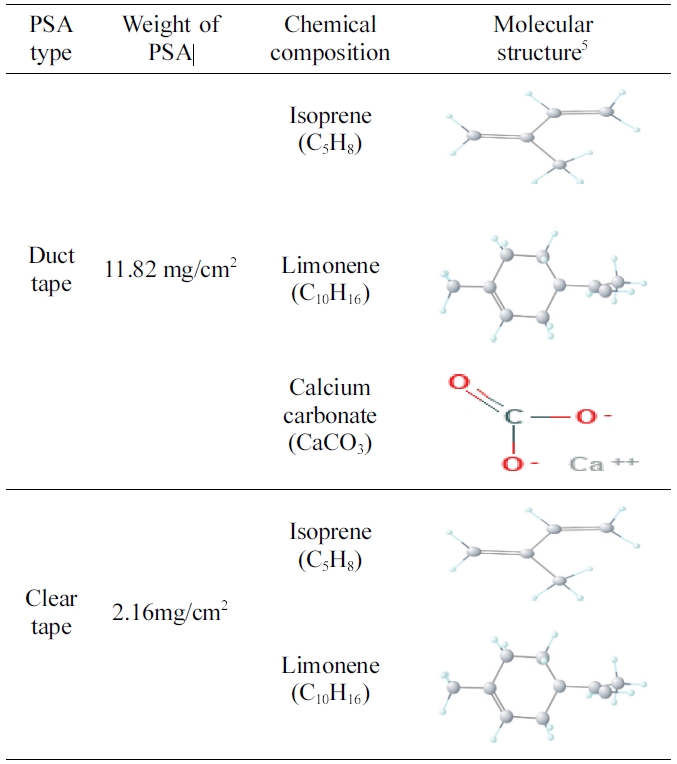 감압 접착제 선정 및 분석. 광고물 부착용으로 사용되고있는 상용 감압 접착제류(면테이프와 투명테이프: 3M, 오공, 금성, 영진, 혜성) 중에서 박리특성이 매우 안정적이며, 감압접착제간 특성 편차가 적은 3M 사의 면테이프 3M 3015 및 투명테이프 3M 372KS를 실험 테이프로 선정하였다. 이 두종류 테이프의 화학성분 및 점착력 차이를 구분하기 위해서, Pyrolysis-GC/MS로 점착제의 화학성분을 분석하고 각각의 면 테이프와 투명테이프에서 점착제 만을 추출하여 무게를 비교하였다. 그 결과는 Table 1에 제시하였다.
