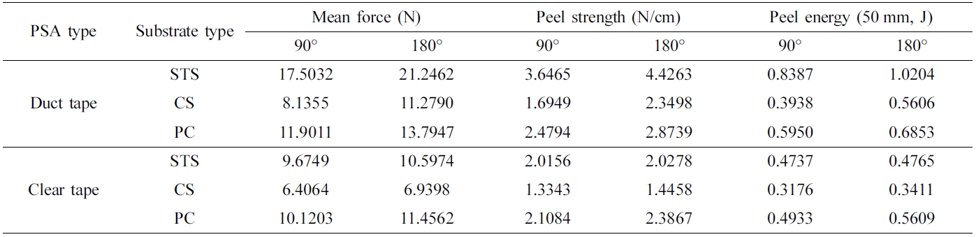 각 기판 별로 박리강도의 크기와 단위 박리에너지의 소모량이 다른 이유는 대상 시편의 표면 조도와 관련성이 높다. 스테인리스강은 Ra:0.087 μm, 탄소강은 Ra:0.928 μm, 분체도장은 Ra:0.604 μm로써, 표면 조도 증가에 따라서 박리강도와 박리에너지는 감소하게 되는데, 대상 기판의 표면에서 미세한 틈이 증가할수록 점착제가 부착되는 유효면적이 감소하기 때문에 박리강도와 박리에너지는 상대적으로 낮아지게 된다. 이에 대한 구체적인 내용은 조도에 대한 박리특성 평가에서 상세히 설명하고자 한다.