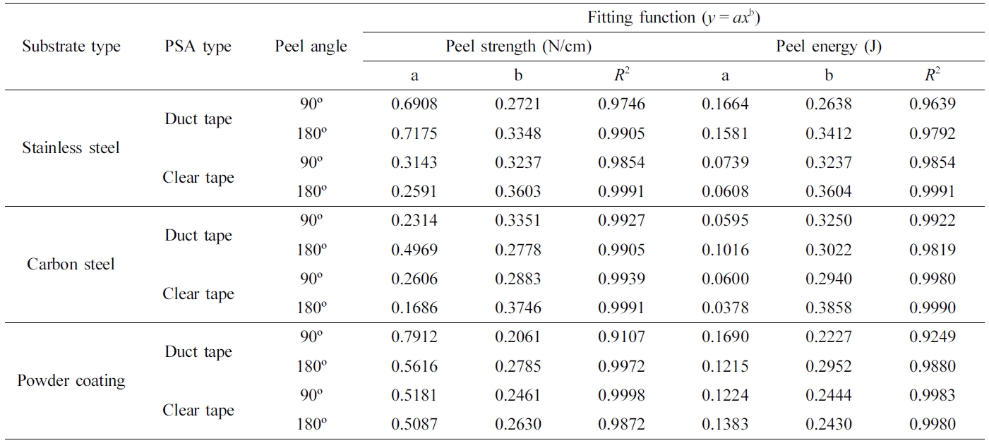 Table 3은 테이프 박리강도와 박리에너지에 대하여 피팅 (fitting)한 함수를 정리한 것으로서, 다음과 같은 관계식을 도출하였다. 스테인리스강에서 90° 로 면테이프를 박리할 때 박리강도와 박리속도는 y = 0.6908x0.2721(R2= 0.9746)인 관계가 있으며, 180°로 박리할 때에는 y = 0.7175x0.3348(R2= 0.9905)로써, 박리속도에 따른 신뢰성 높은 박리특성 평가를 할 수 있다. 또한 동일한 조건에서 탄소강은 90°로 박리할 때, y = 0.2314x0.3351(R2= 0.9927)인 관계가 있고, 180°로 박리할 때에는 y = 0.4969x0.2778(R2= 0.9905)로 측정되었다. 분체도장은 90°로 박리할 때 y = 0.7912x0.2061(R2= 0.9107)인 관계가 있으며, 180°로 박리할 때에는 y = 0.5616x0.2785(R2= 0.9972)로 분석되었다.