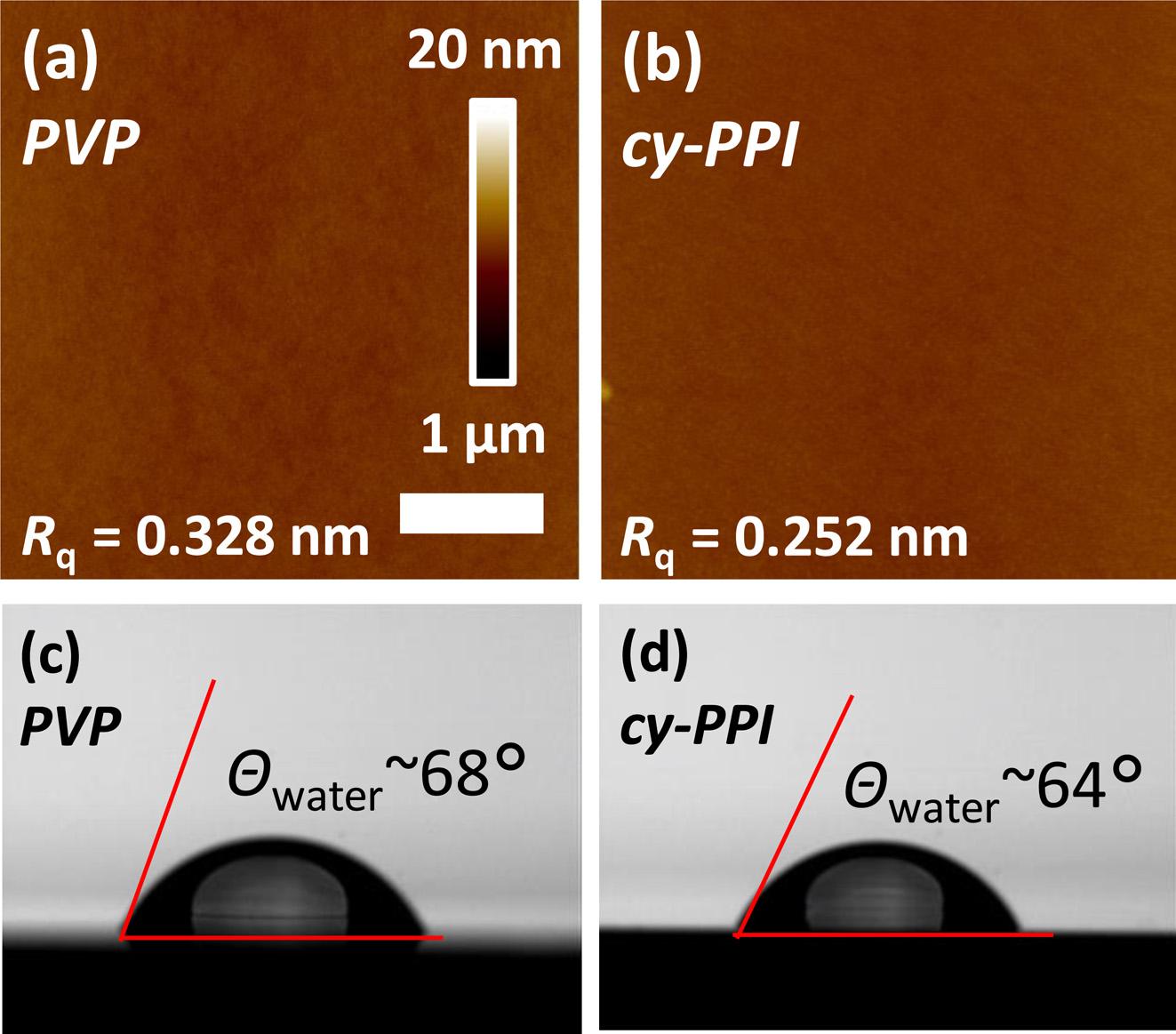 Figure 4 (a,b) AFM images; (c,d) water contact angle values of the (a,c) PVP and (b,d) cy-PPI films. |