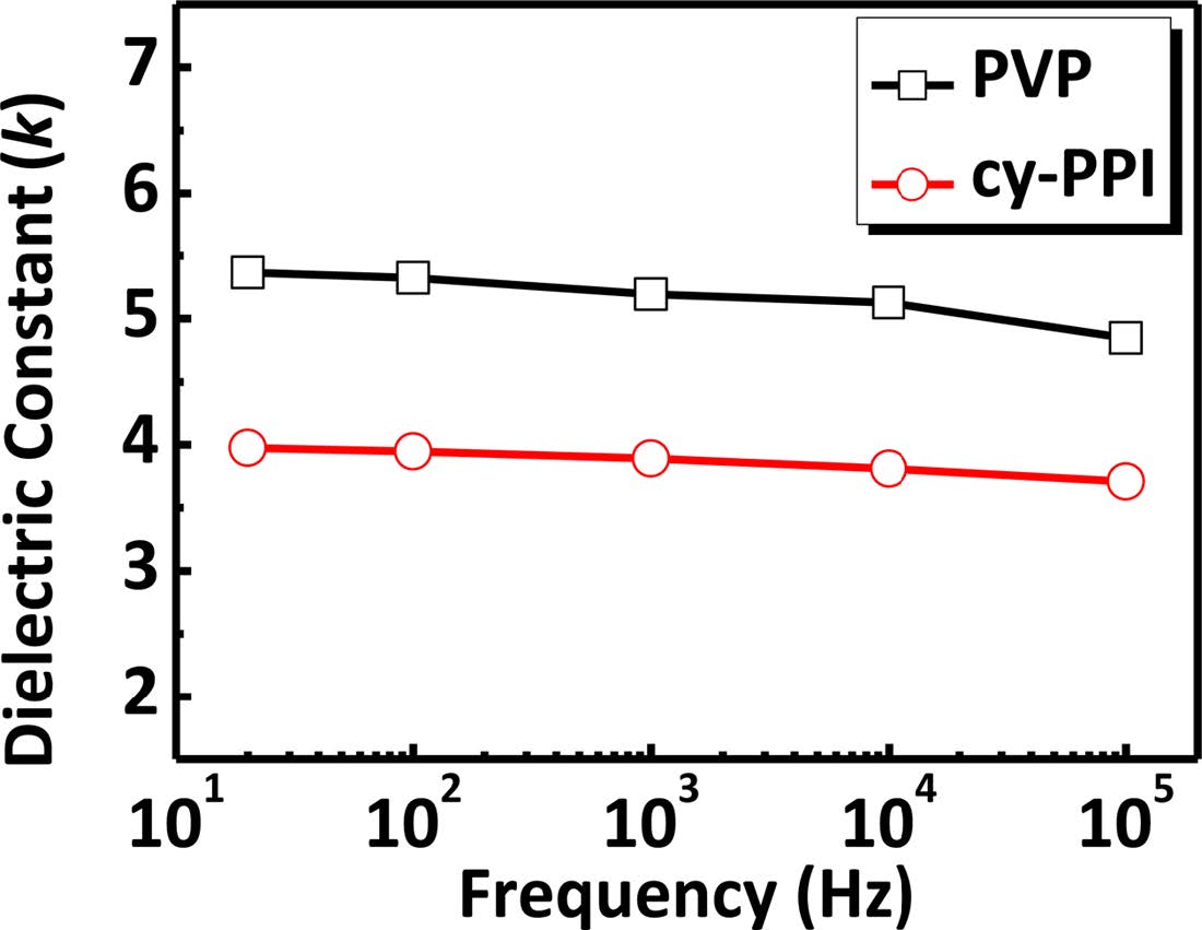 Dielectric Characterization. To characterize the dielectric bulk properties, we fabricated metal-insulator-metal (MIM) structures by sandwiching 280-nm-thick polymer layers between the gold electrode and Si substrate. Capacitance (C), corresponding to the amount of charge stored in a gate dielectric at a specific voltage, is defined by C = kε0A/d, where ε0 is the permittivity of free space, A is the area of the capacitor, and d is the thickness of the gate dielectric. Capacitance was measured at various frequencies to investigate its stability. If capacitance is changed, the semiconductor may operate in a different regime and the density of carriers in the channel may be changed. That is to say, the drain current in the OFET may be influenced by capacitance. Therefore, a low frequency dependence is desired for stable OFET operation. As plotted in Figure 6, dielectric constants were calculated from capacitance values for cy-PPI and PVP at 20 Hz, 100 Hz, 1 kHz, 10 kHz, and 100 kHz. Notably, the values of the dielectric constant of cy-PPI were maintained between 3.7 and 4.0 for all tested frequencies. Cy-PPI showed a more stable capacitance than did PVP (PVP gave dielectric constant values of 4.8-5.4 for the same ranges). Unreacted hydroxyl groups in the PVP gate dielectrics may have easily attracted water and mobile ions, thus causing slow polarization leading to a difference between the capacitance values at low frequencies and high frequencies.26