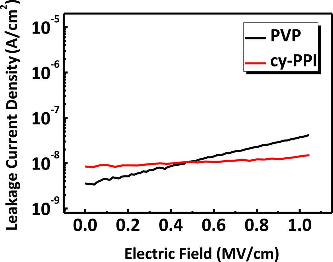 The leakage current of a gate dielectric layer should be as low as possible because it has a significant impact on the electrical performances of devices such as off current.27 Typical traces of leakage current density as a function of electric field strength are plotted for the cy-PPI and PVP films in Figure 7. The leakage current density of cy-PPI was maintained at about 10 nA/cm2 from 0 to 1 MV/cm. In contrast, the leakage current density of PVP increased significantly as the electric field strength was increased in this same range, and reached a value of 50 nA/cm2 at 1MV/cm.