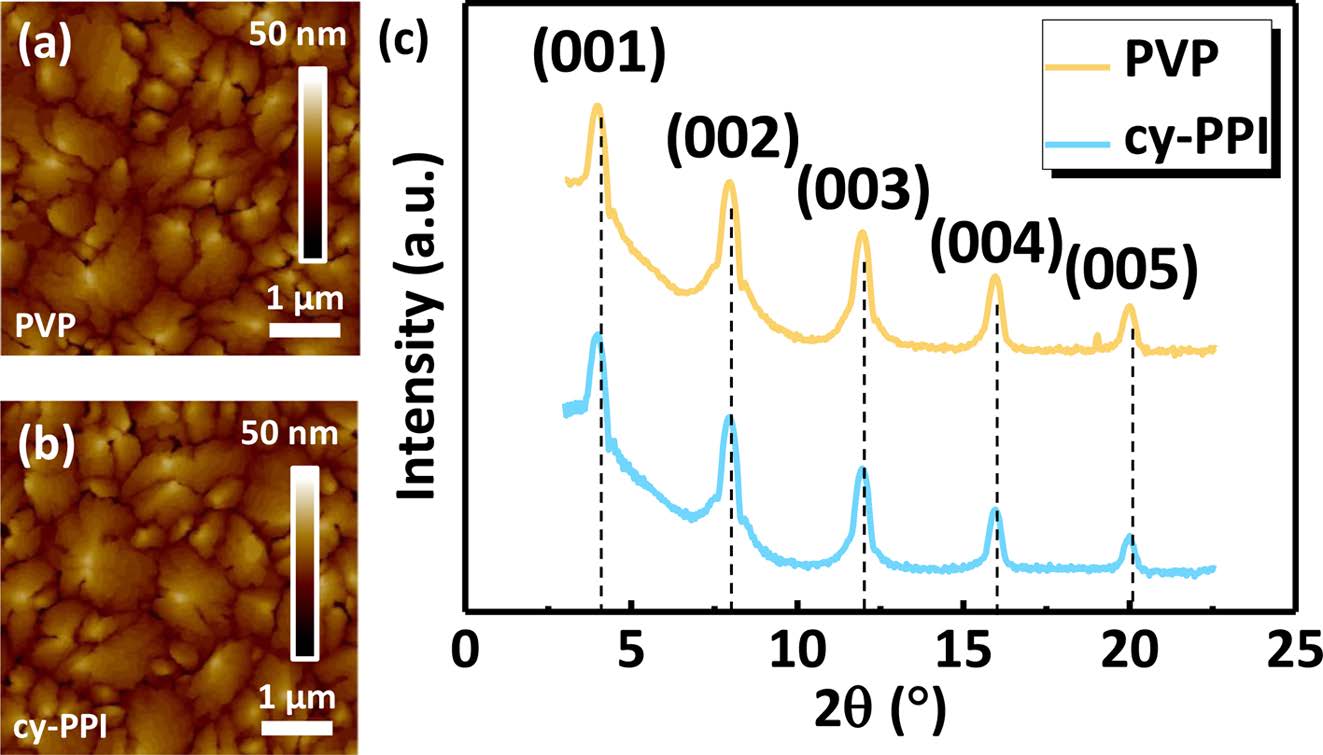 Figure 8 (a,b) AFM images; (c) XRD patterns (out-of-plane) of pentacene on (a,c) PVP and (b,c) cy-PPI films. |