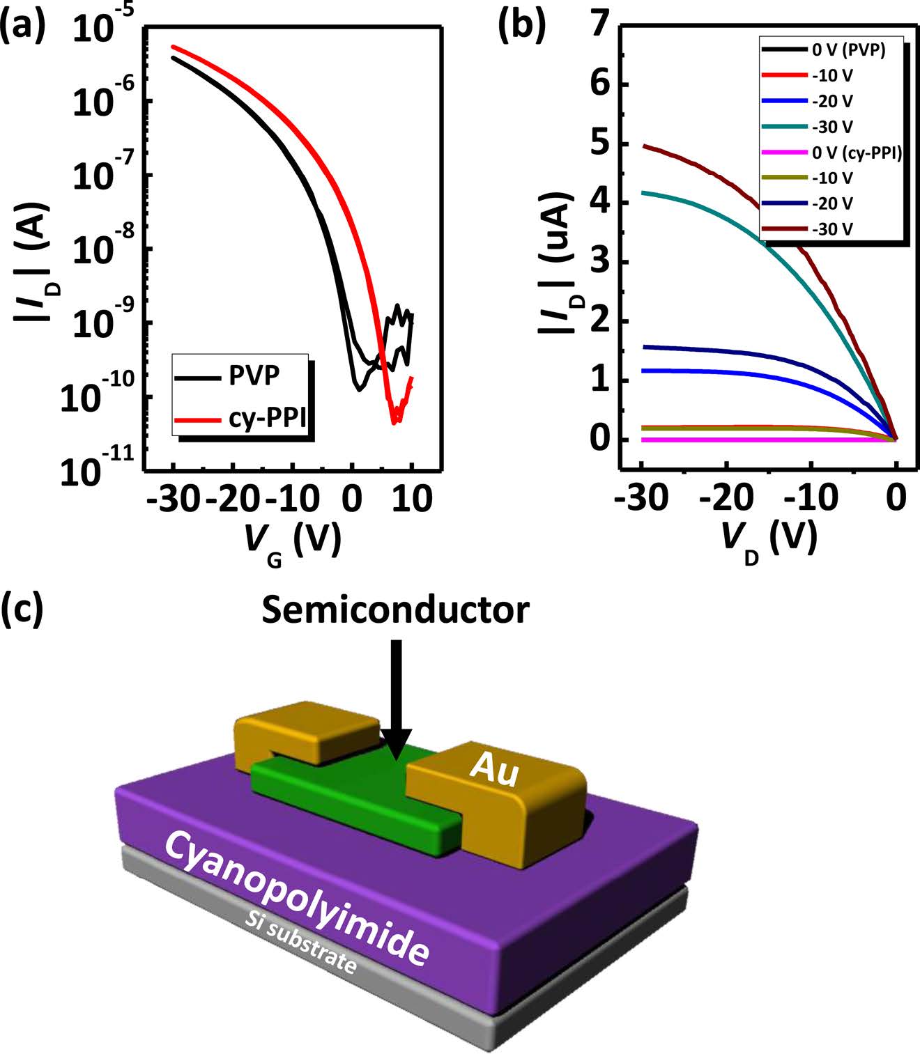 Electrical Characterization. To demonstrate the potential use of cy-PPI as a gate dielectric layer in OFETs, we fabricated a pentacene-based device. Figure 9 shows transfer and output characteristics of pentacene OFET devices based on cy-PPI and a schematic images of the prepared OFET device in this study. For securing reliability, more than 30 pentacene devices were tested in this study. In pentacene TFTs with a cy-PPI gate dielectric, charge carrier mobility, Vth, on/off ratio and SS were measured to be 0.15 cm2/Vs, -5.02 V, 1.2×105, and 1.94 V/ decade, respectively. On the other hand, those values of pentacene with the PVP gate dielectric were 0.12 cm2/Vs, -10.58 V, 3.0×104, and 2.12 V/decade, respectively. Average device electrical performances are also summarized in Table 2. The cy- PPI-based TFTs showed an overall better electrical performance than did the PVP-based TFTs. Hysteresis effects were negligible and gate leakage current was lower by several orders of magnitude than the source - drain current (< 10-8 A). Figure 9(b) shows the output characteristic curves of the cy- PPI, and PVP device; it exhibited typical p-type characteristics.