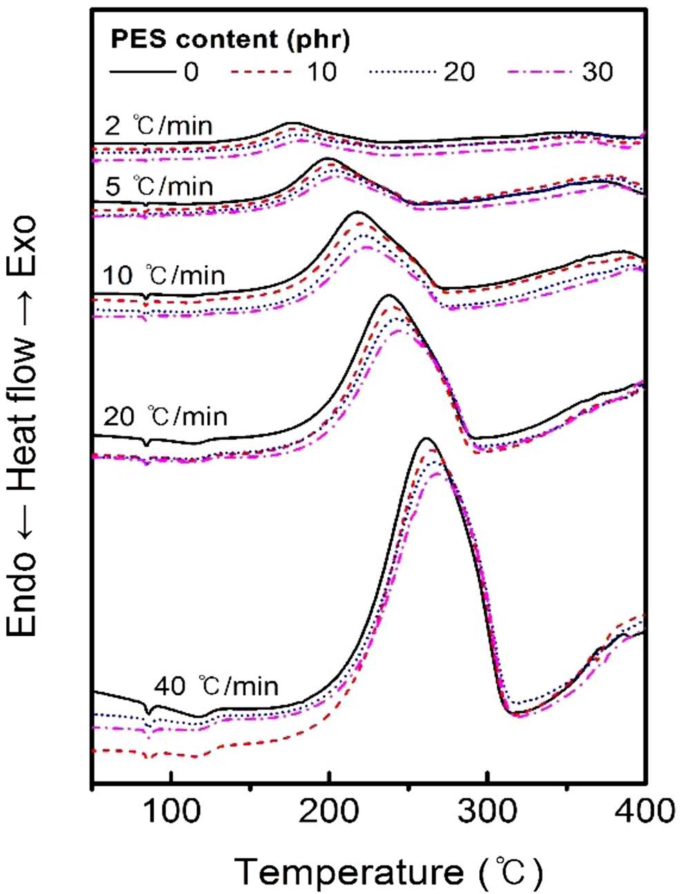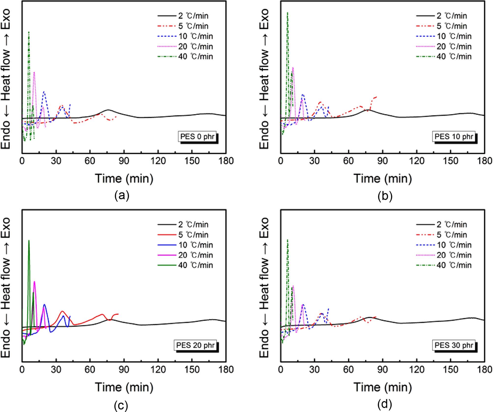 승온경화 분석. 열경화성 수지의 경화반응 거동을 이해하는 중요한 변수가 되는 반응열(heat of reaction)과 활성화에너지(activation energy, Ea)를 구하기 위해 승온분석을 실시하였으며, Figure 23에 승온속도와 PES 함량에 따른 발열곡선을 온도와 시간에 관하여 측정한 것을 나타내었다.