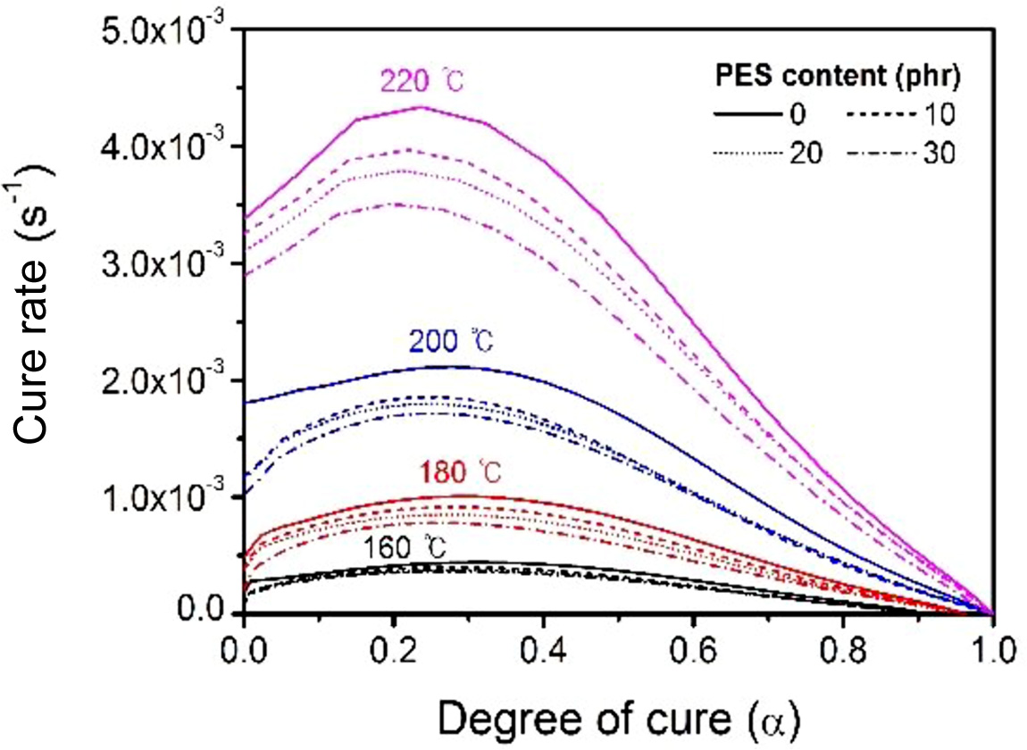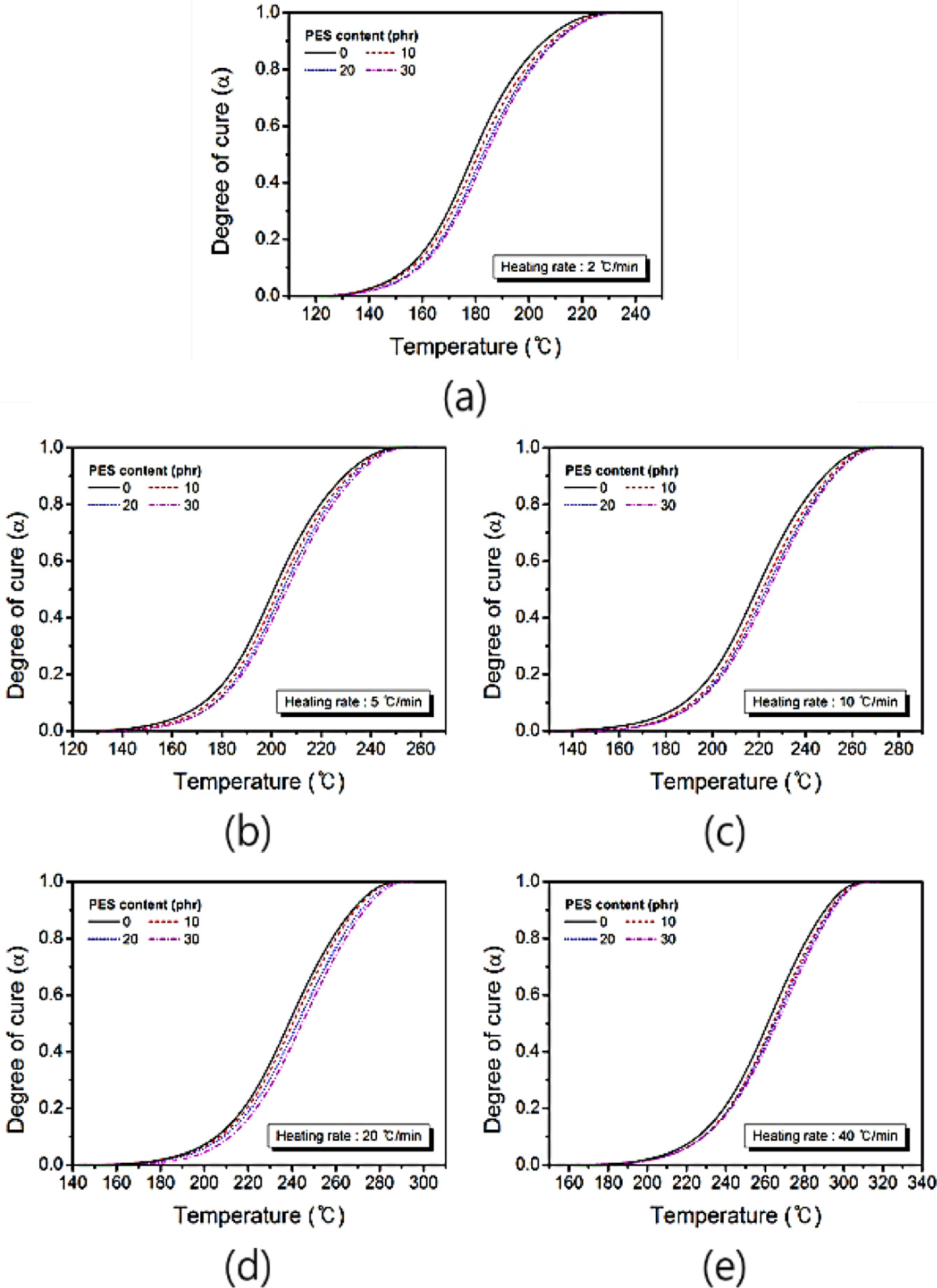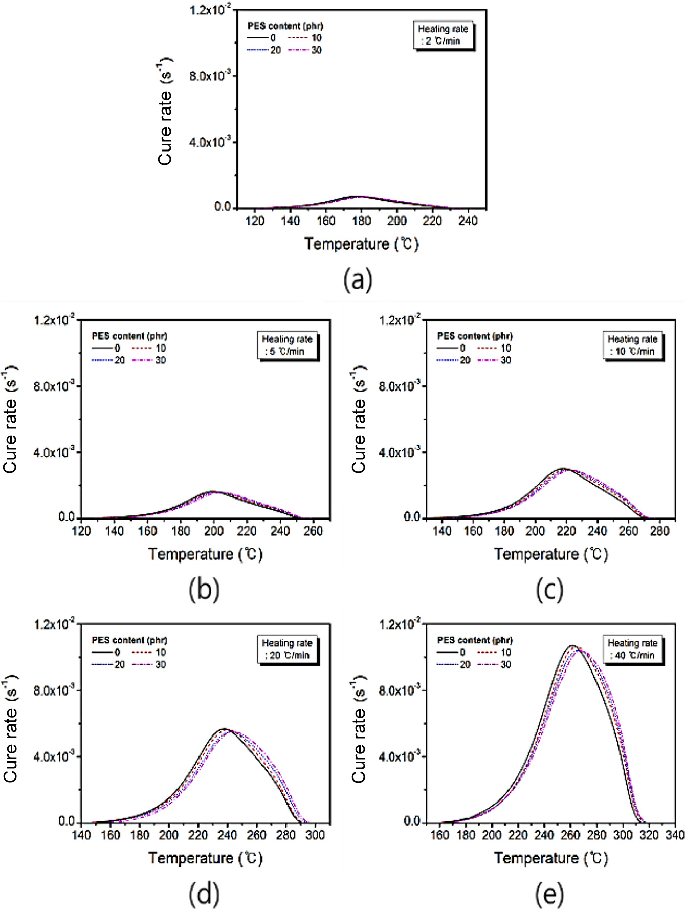 식 (7)과 (8)을 이용하여 PES 함량에 따른 경화도와 경화속도를 도출하였으며, 그 결과를 각각 Figure 45에 나타내었다. 승온속도가 빠르고 PES 함량이 높을수록 높은 온도에서 경화되지만, PES 함량에 따른 차이는 크게 나타나진 않았다. 경화속도의 경우, 승온속도가 빠를수록 증가하였으나 PES가 첨가됨에 따라 경화속도가 소폭 감소하였다.