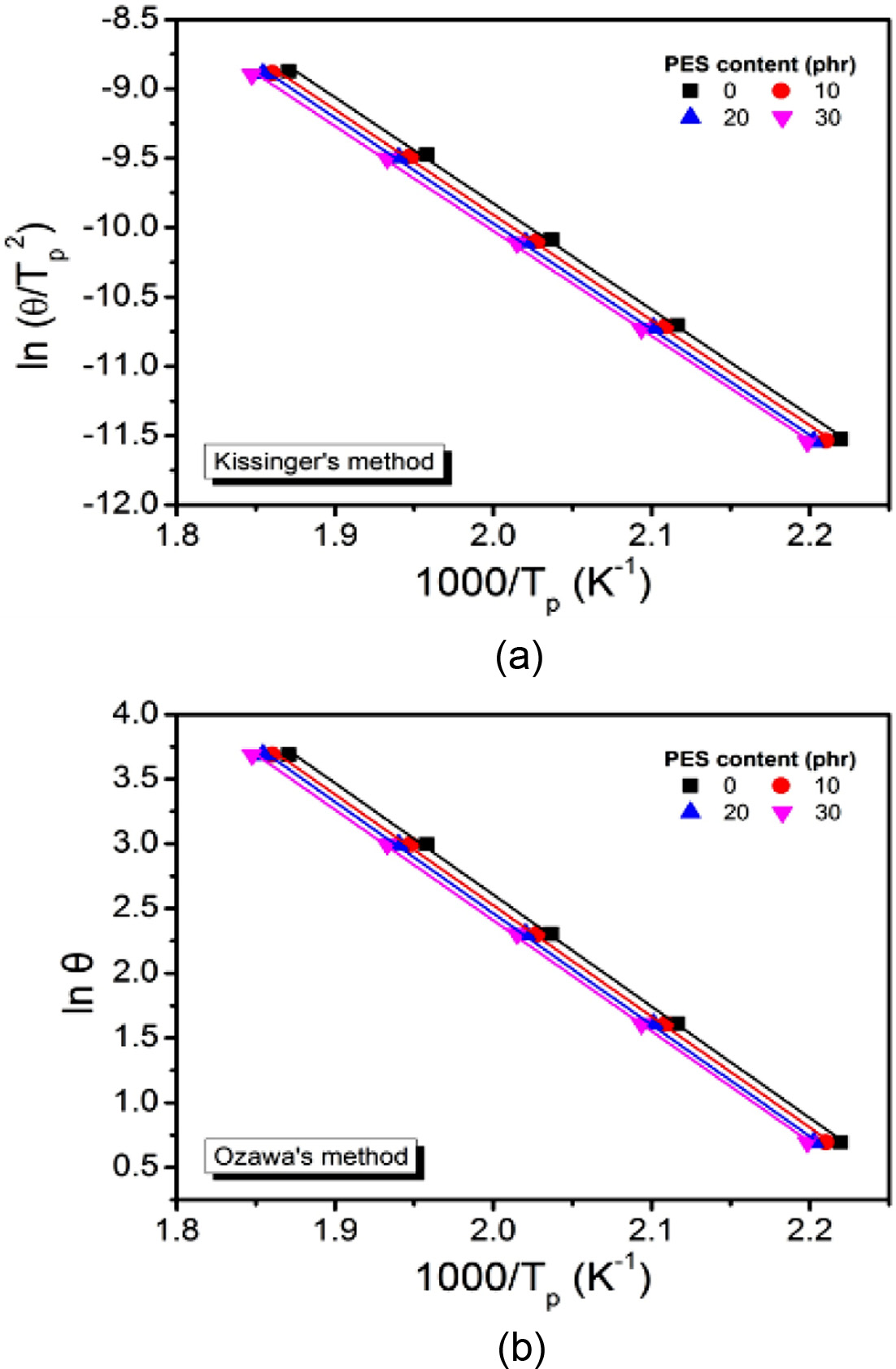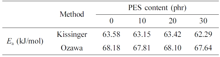 Kissinger법과 Ozawa법을 이용하여 ln(θ/Tp2) 대 1000/Tp와 lnθ 대 1000/Tp의 그래프를 Figure 6에 나타내었으며, 그래프의 기울기로부터 얻은 활성화에너지를 Table 3에 나타내었다. 두 결과 모두 일관적인 경향성을 발견할 수 없었다. PES가 첨가되지 않은 경우를 제외하고도 PES의 함량에 따른 활성화에너지는 전체적으로 큰 차이가 나타나지 않았다.