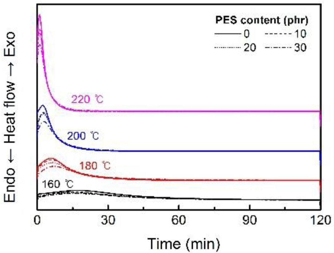등온경화 분석. 등온 DSC 분석을 통해서 특정 온도에서의 경화도와 경화완료시간을 파악할 수 있으며, 열경화성 수지성형을 위한 최적 경화조건을 제시할 수 있는 바탕이 된다. 이를 위해 여러 온도에서의 경화 시 발열량 변화와 경화반응 메커니즘에 대해 고찰하였고, Figure 7에 다양한 경화온도와 PES 함량에 따른 발열 곡선을 나타내었다.