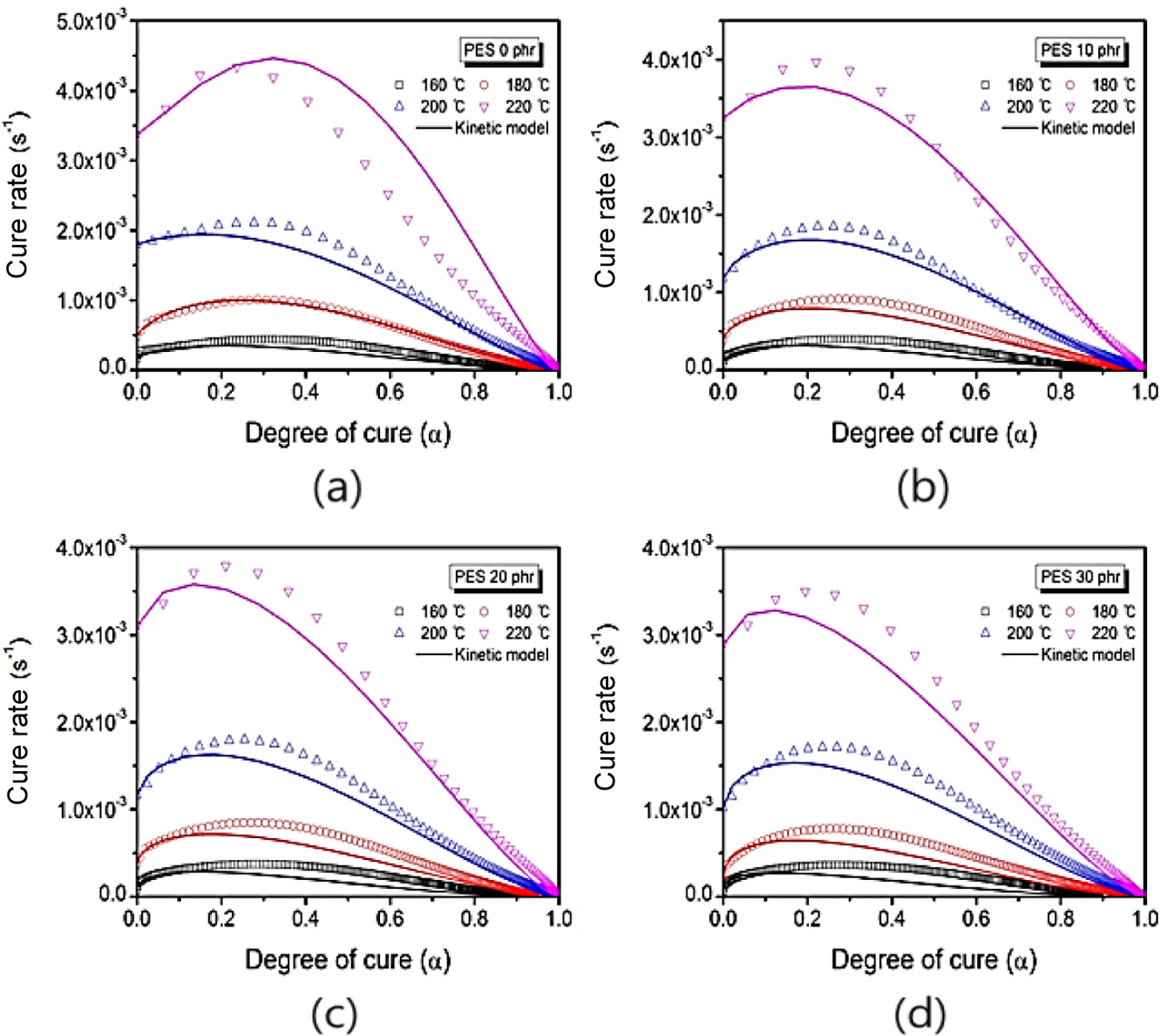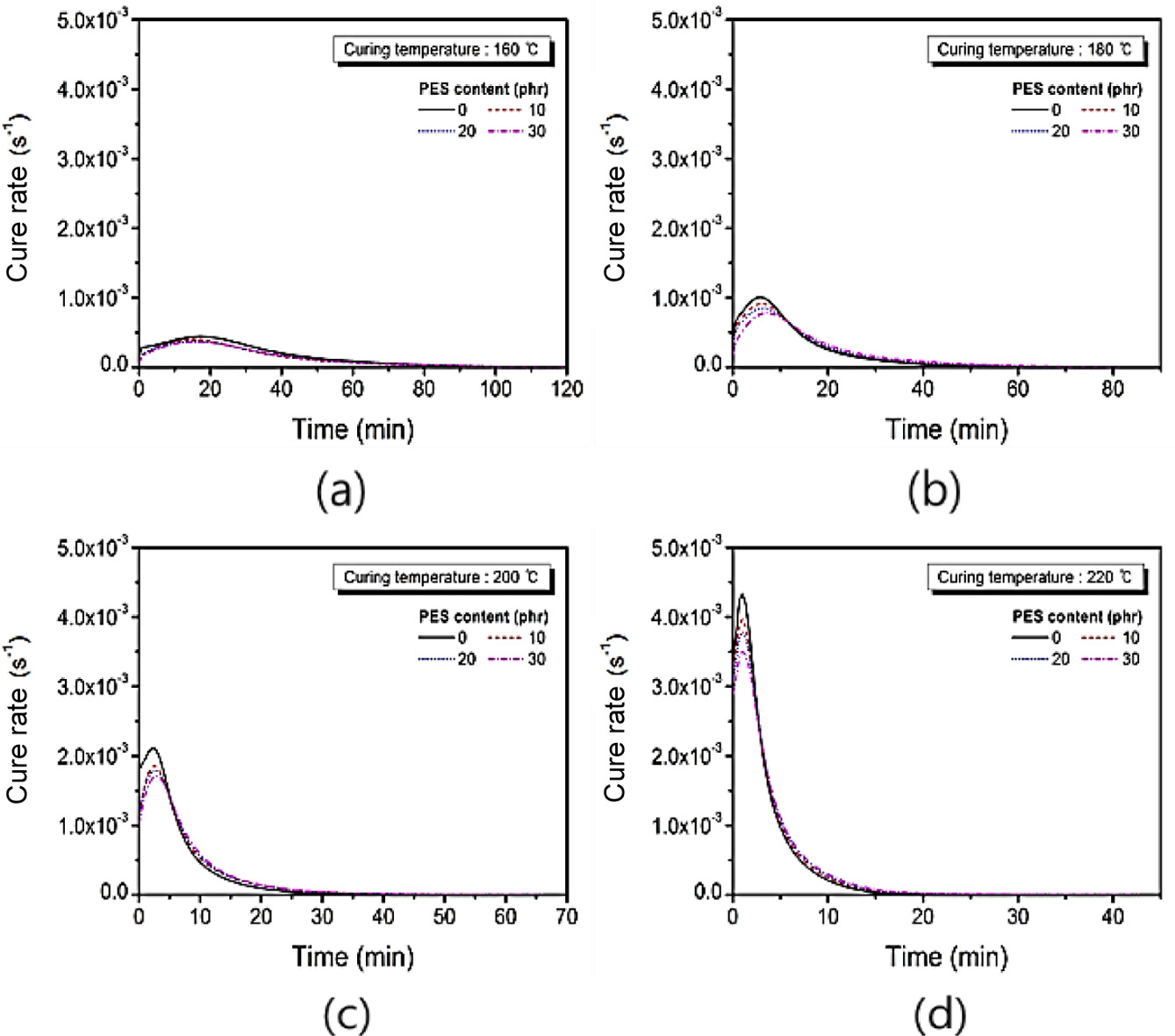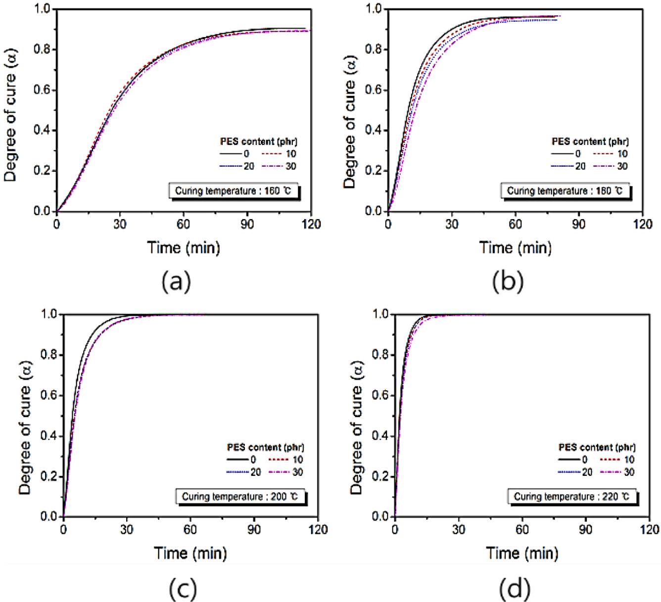 Cure rate with PES content at different curing temperature: (a) 160 ℃; (b) 180 ℃; (c) 200 ℃; (d) 220 ℃.