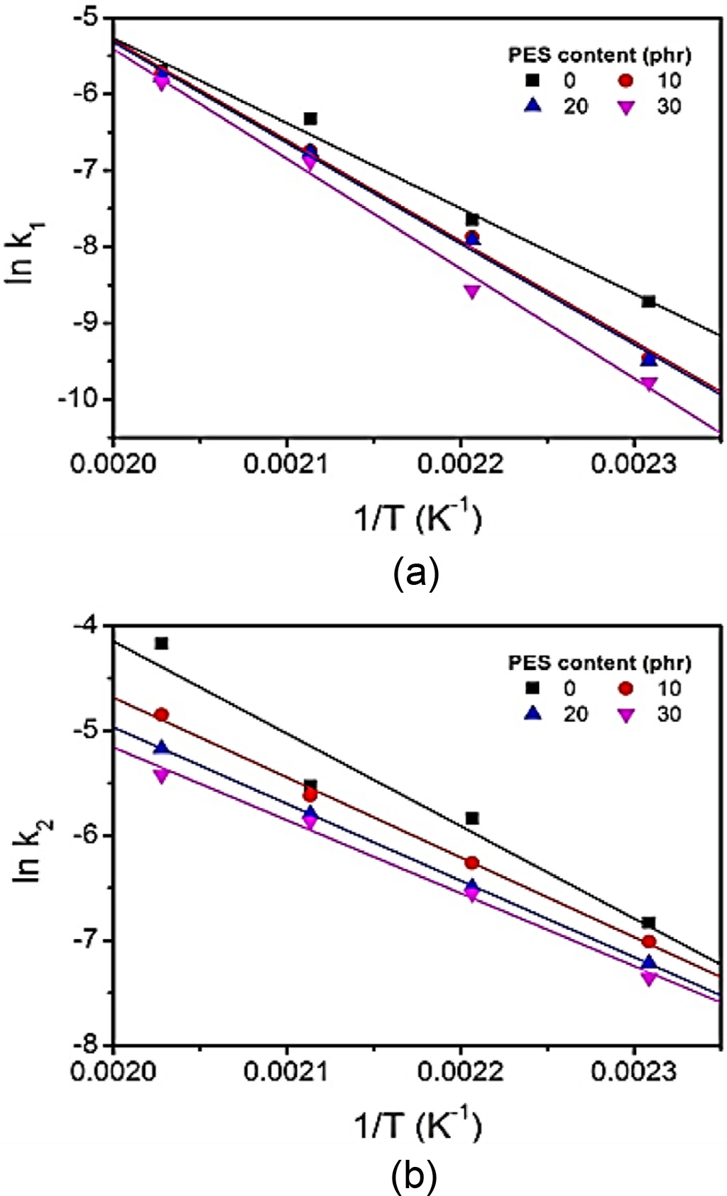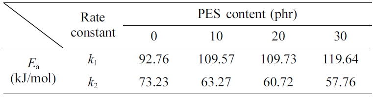 또한 도출한 속도론적 변수를 대입하여 실험값과 속도론적 모델과 비교하였고, 이를 Figure 11에 나타내었다. 앞서의 결과를 바탕으로 Arrhenius 식에 적용하여 활성화에너지를 구한 결과, 속도상수 k1으로부터 결정된 활성화에너지는 PES함량이 높을수록 증가하고, k2로부터 결정된 활성화에너지는 PES 함량이 높을수록 감소하는 것으로 나타났으며, 이를 Figure 12와 Table 5에 나타내었다. 이는 k1의 경우 PES에 의해 경화 속도가 느려지는 영향을 미쳤고, k2의 경우 경화 속도가 빨라지는 영향을 나타낸 것으로 사료된다.