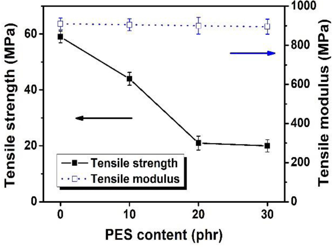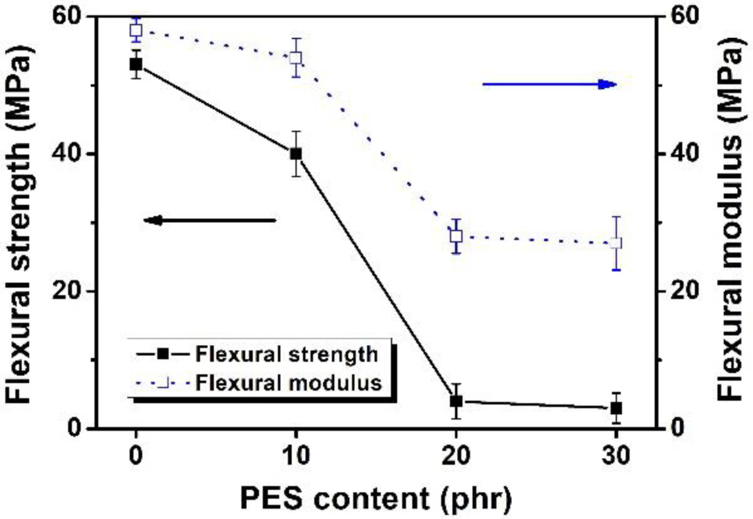 인장 및 굴곡 특성. 에폭시 수지 경화시편을 제조하여 PES첨가에 따른 인장 및 굴곡 특성을 평가하였다. 인장강도 및 탄성률, 굴곡강도 및 탄성률을 각각 Figure 1314에 나타내었다. 인장강도와 인장탄성률 모두 PES 함량이 증가할수록 감소하였으며, PES의 함량이 30 phr일 때, PES를 첨가하지 않은 시편에 비교하여 강도는 약 64%, 탄성률은 약 2.5% 감소함을 확인하였다. 굴곡특성도 마찬가지로 인장특성 결과와 유사하게 그 값이 감소하는 경향을 나타냈으며, 굴곡강도와 탄성률이 PES 미첨가 시편과 비교하였을 때, PES 함량 30 phr의 조건에서 각각 약 93, 53% 감소함을 확인할 수 있었다. 이는 PES 함량이 증가할수록 경화되는 부분이 상대적으로 감소하고, PES가 에폭시의 가교결합 형성을 방해하거나 에폭시 수지 내에 불균일한 상을 형성하여 나타난 결과로 사료된다.