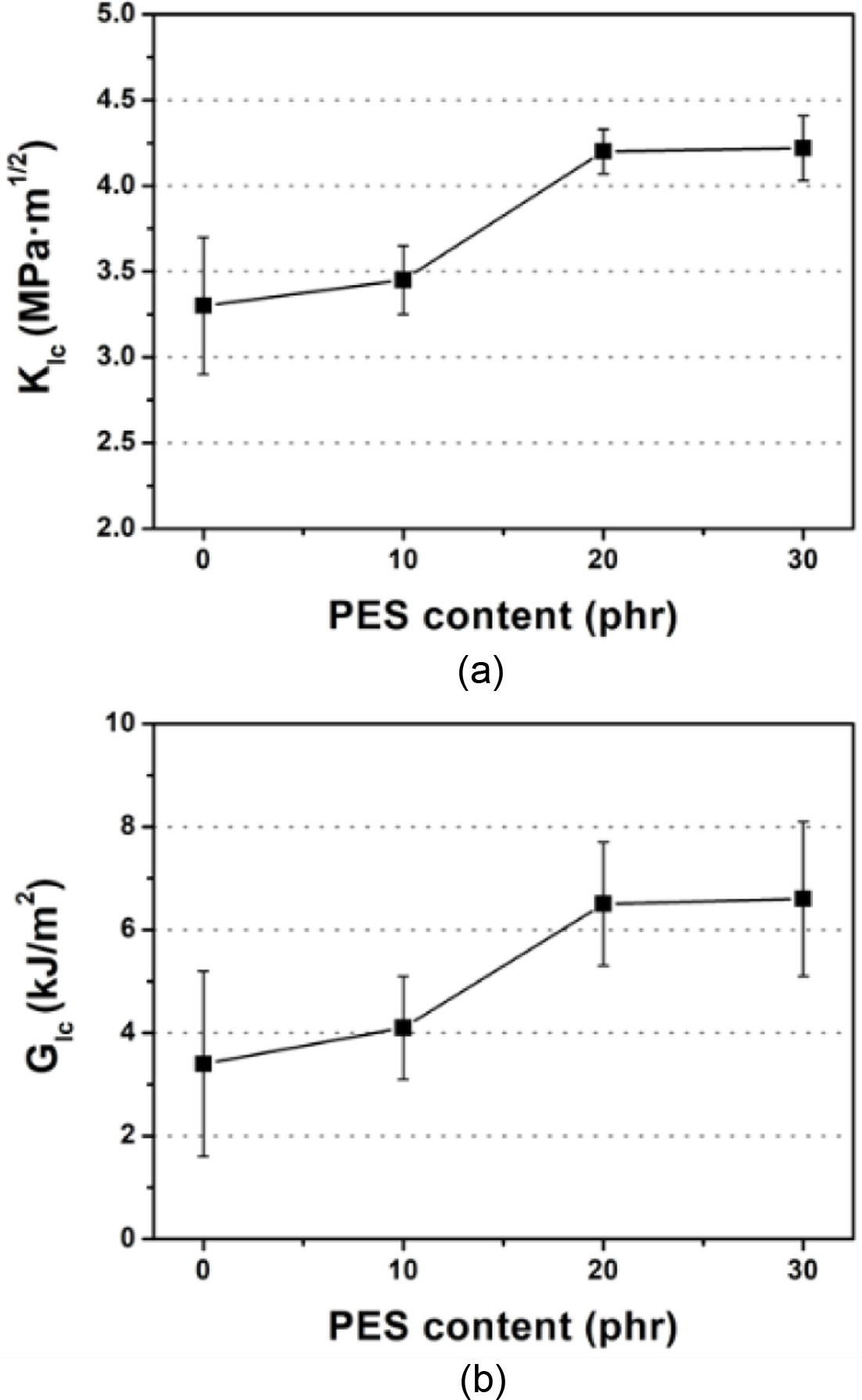 파괴인성. PES 첨가에 따른 수지의 계면특성을 분석하기 위해 균열(crack) 성장에 대한 저항을 나타내는 인자인 임계 응력세기인자(KIc)와 임계변형에너지방출률(GIc)을 구하고 이를 평가하였다. 임계응력세기인자는 시편 및 균열의 형태와 적용된 하중값에 따른 균열 끝 부근의 응력의 상태로 서술되며, 임계변형에너지방출률은 탄성에너지에 의해 균열로부터 새로운 파단면이 형성될 때 균열의 가장자리로부터 전달되는 단위길이에 따른 에너지를 의미한다.9 PES 함량이 증가함에 따라 임계응력세기인자와 임계변형에너지방출률 모두 증가하였고 그 결과를 Figure 15에 나타내었다.