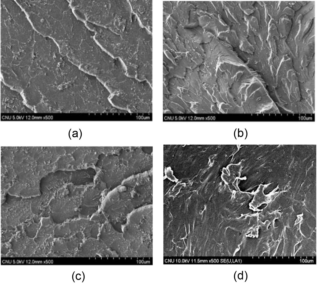 SEM images of fracture surfaces with PES content: (a) 0 phr; (b) 10 phr; (c) 20 phr; (d) 30 phr.