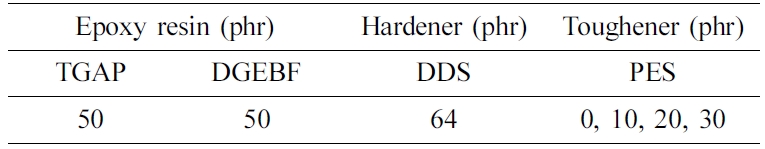 재료. 본 연구에 사용된 에폭시 수지는 3관능성인 triglycidyl p-aminophenol(TGAP)과 2관능성인 diglycidyl ether of bisphenol F(DGEBF)를 사용하였다. 에폭시 수지의 경화제로는 4,4-diaminodiphenylsulfone(DDS)을 사용하였고, 강인화제로는 0.1 μm의 크기를 가지는 polyethersulfone(PES)을 Gharda Chemicals Company로부터 구매하여 사용하였다. 본 연구에 사용된 TGAP, DGEBF, DDS, PES의 조성과 화학구조를 Table 1과 Figure 1에 나타내었다.