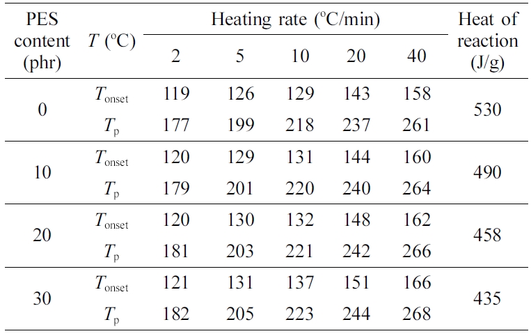 발열이 시작되는 지점의 변곡점은 반응개시온도(Tonset)를 나타내며, 발열곡선의 면적으로부터 경화반응의 발열량을 계산하였다. 단, 발열량은 각 PES 함량별로 나타내었으며, 승온속도 2, 5, 10, 20, 40 ℃/min일 때의 발열량을 전부 계산하고 그 평균값으로 결정하였다. Table 2에는 PES 함량에 따른 반응개시온도, 발열피크온도(Tp), 발열량을 나타내었다. 승온속도와 PES 함량이 높을수록 반응개시온도와 발열피크온도가 모두 증가하는 것으로 나타났으나, 그 차이는 1~4 ℃ 정도로 큰 차이를 보이지는 않았다. 경화반응의 발열량은 PES 함량이 높을수록 감소하였는데, 이는 단위질량당 포함된 에폭시의 양이 PES 함량이 증가함에 따라 상대적으로 감소하여 단위질량당 반응에 참여한 반응물이 적어지기 때문이다.