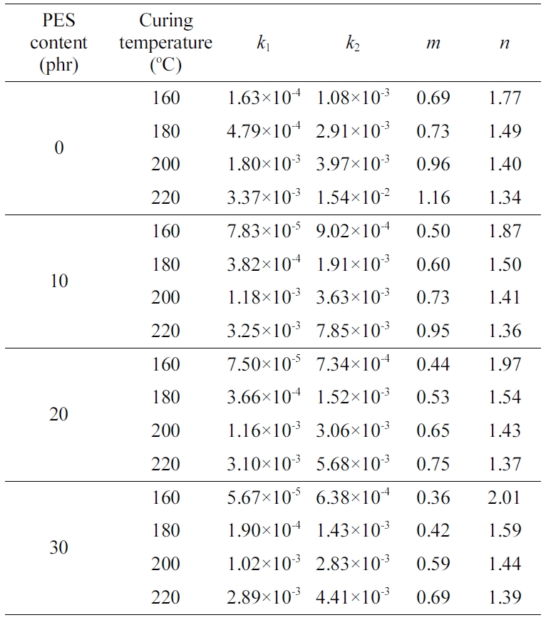 반응속도론에서의 일반적인 속도는 식 (11)로 표현할 수 있고, 자촉매 효과를 고려하여 Kamal이 고안한 식 (12)를 적용하여 각 경화온도 및 PES 함량별 속도론적 변수(kinetic parameters)를 도출하였다.7