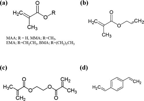 Figure 1 Chemical structures of acrylic monomers and crosslinking agents used in this study: (a) MAA; MMA; EMA; BMA; (b) AMA; (c) EGDMA; (d) DVB. |