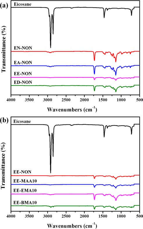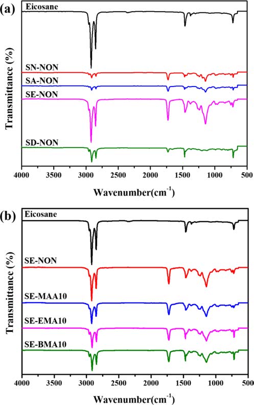 FTIR Spectra. Figures 2 and 3 show the FTIR spectra of pure eicosane and selected microcapsules prepared with varying crosslinking agent and 10% acrylic comonomers by suspension and emulsion polymerization, respectively. First, the intense peaks at 2925 and 2830 cm-1 in pure eicosane represent the C–H stretching vibration. All microcapsules prepared by suspension polymerization show the same peaks, in which C–H stretching vibration of eicosane and polymer shell might be assigned to be overlapped. The C–H stretching peaks of eicosane are usually strong irrespective of particle diameters which might cause total reflection only on the shell thicker than 2 μm. In the process of specimen preparation of FTIRATR, the microcapsules were assumed to be broken and lead the leakage of eicosane. The peaks at around 1469, 1387 and 715 cm-1, which can be observed in both pure eicosane spectrum and each microcapsule spectrum, are the characteristic bands for eicosane. Spectra of all microcapsules have peaks at about 1727 and 1145 cm-1, which is attributed to C=O stretching vibration and C–O stretching of the ester group in the polymer shell, respectively. The weak peak at 1660 cm-1 observed in the spectra of microcapsule with DVB (SD-NON, EDNON) as crosslinking agent can be assigned to the benzene ring stretching vibration. Thus, it can be concluded that FTIR spectra of all microcapsules have the characteristic peaks of both polymer shells and eicosane, which verifies the success for microencapsulation of eicosane as a core. In the case of emulsion polymerization, the relative intensities of C–H stretching to C=O stretching are almost very weak in comparison with suspension polymerization, which means that the weight portions of encapsulated eicosane are small.