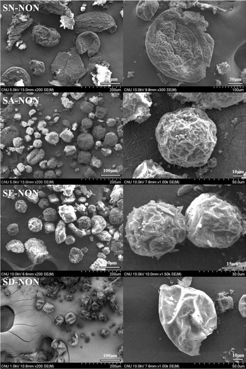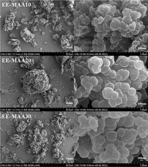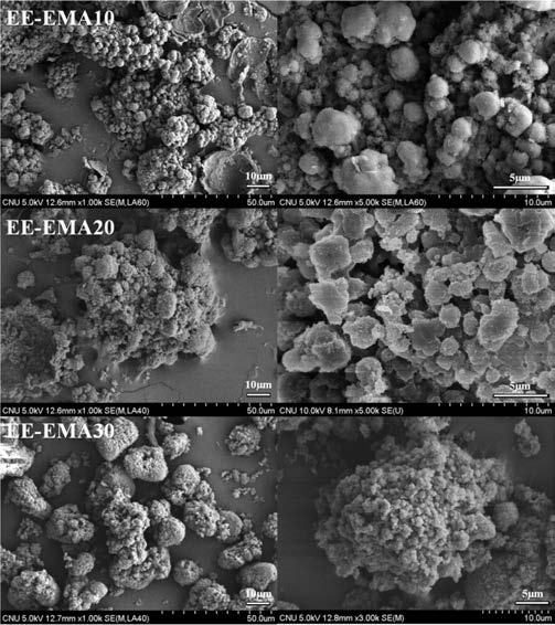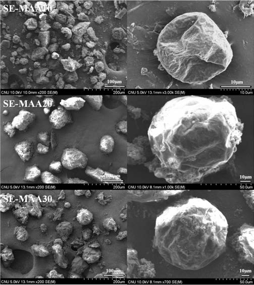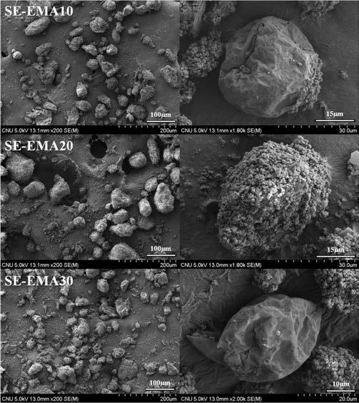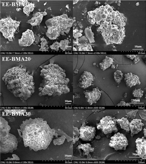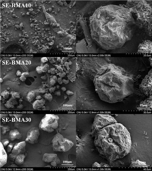 Figures 5, 6, and 7 show the SEM images of microcapsules different only in used comonomers in suspension polymerization. The reported glass transition temperatures of homopolymers of PMMA, PMAA, PEMA, and PBMA are 120, 228, 65, and 20 ℃, respectively, which affects the hardness of the polymerized shell part of microcapsules.