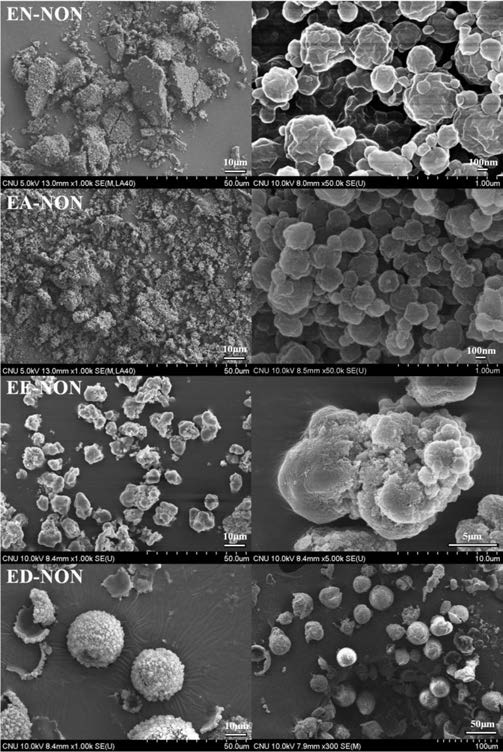 The microcapsules obtained by emulsion polymerization show degree of surface morphology difference from ones of suspension polymerization. They are usually much smaller in particle size, spread under 20 μm, and have a much smoother surface. Additionally, they are obtained in the cluster form of particles, which are almost formed in the drying process.14 Figure 8 shows that the effect of crosslinking agent on the particles and their surface morphology is very critical in the case of emulsion polymerization. The uneven surface of emulsion particle, which is usually not observed in conventional emulsion polymerization, is always observed in these microcapsules, which are also resulted from the large density change of polymer shell as well as eicosane PCM core. In the absence of crosslinking agent, as shown in Figure 8(a), the microcapsules show the highest roughness. The microcapsules prepared using AMA show relatively smoother surface, with the particle diameter of 200-300 nm that is estimated as a size-range of usual emulsion polymerization. On the other hand, the apparent shape of microcapsules prepared with EGDMA as crosslinking agent is very irregular and diverse, the cause of which will be analyzed more precisely in future. The microcapsules prepared with DVB as crosslinker are spheres having rough surface and narrow size distribution. The latter two cases of EGDMA and DVB show much larger particle size than conventional emulsion polymerization.