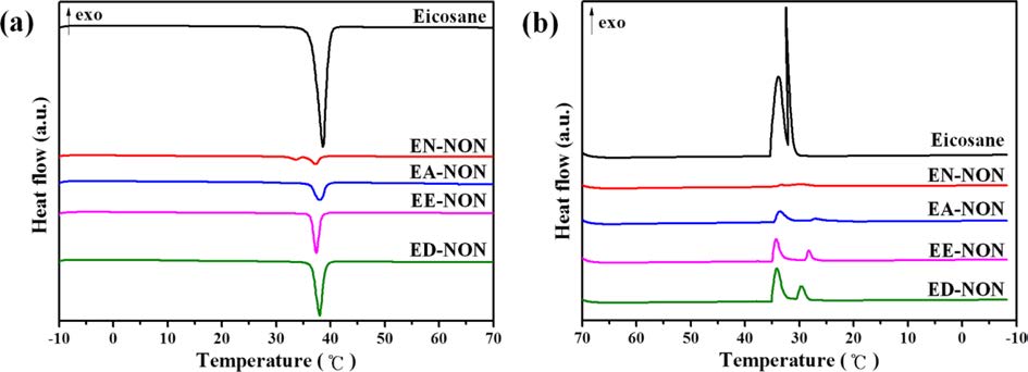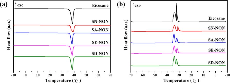 where ΔHm,PCM and ΔHc,PCM are the melting and crystallization enthalpies of pure eicosane, respectively. ΔHm,Microcapsules and ΔHc,Microcapsules are the melting and crystallization enthalpies of eicosane in microcapsules, respectively.