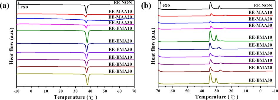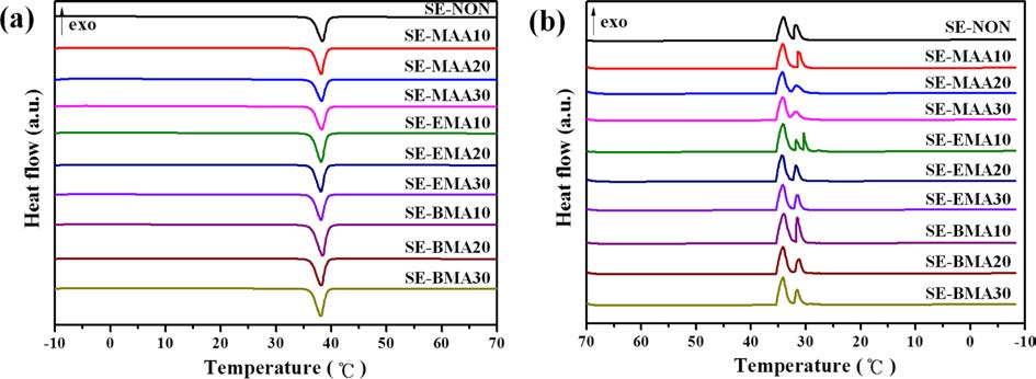 Figure 15 DSC heating (a); cooling (b) thermograms of microcapsules prepared by emulsion polymerization using various comonomers with various compositions. |