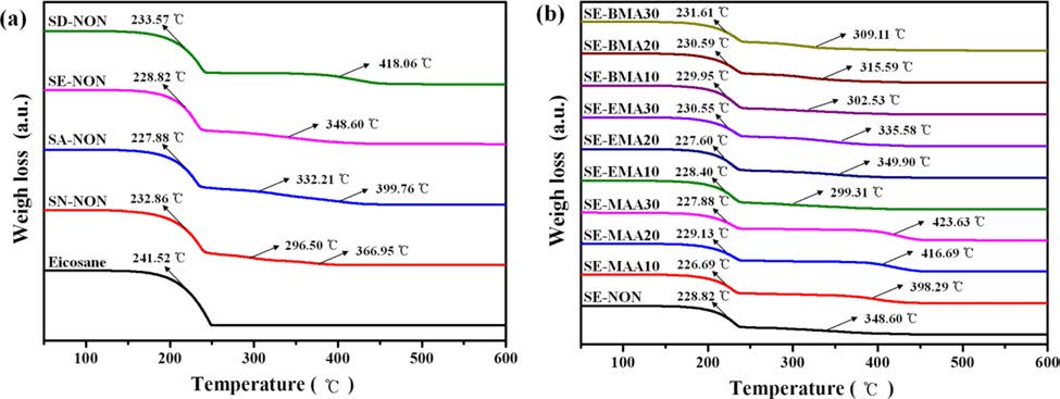 The thermal stability of microcapsules prepared by emulsion polymerization was far inferior to the ones from suspension polymerization. The weight losses related to eicosane appear usually at temperature lower by around 30 ℃ than the cases of suspension polymerization. Second-step weight loss of microcapsule’s shell prepared by emulsion polymerization begins slightly at around 280 ℃, which is estimated as the decomposition of terminal double bond formed during polymerization reaction by the disproportionation termination, followed by decomposition accompanying chain scission around 360 ℃.17