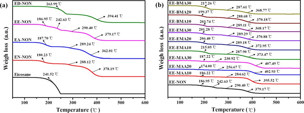 Through the input of comonomer MAA and increase of its quantity, it is possible to enhance strongly the thermal stability of shell of microcapsules compared to PMMA homopolymer networks, as shown in Figure 16(b) and Figure 17(b). On the other hand, the input of comonomers such as EMA and BMA, which provide a softer molecular segment, lowers the thermal stability of polymeric shell networks than the PMMA homopolymer networks.16