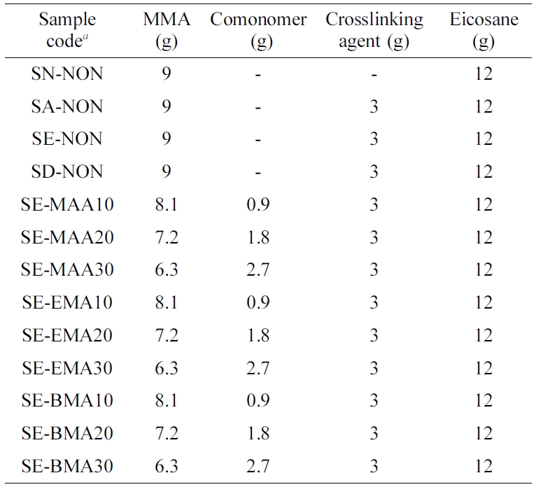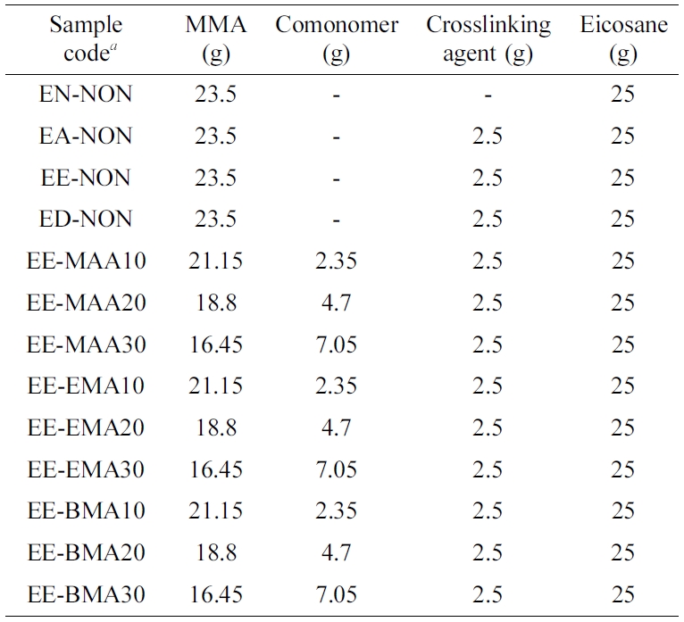 Materials. Eicosane, DVB, ferrous sulphate (FeSO4·7H2O), 70% tert-butyl hydroperoxide solution, and poly(vinyl pyrrolidone) (PVP) were purchased from Sigma Aldrich. Ammonium persulphate (APS), MMA, EMA, and BMA were supplied by Junsei. MAA and AMA were obtained from TCI. EGDMA was purchased from Polysciences. Benzoyl peroxide, sodium thiosulphate (Na2S2O7), and methanol were supplied by Samchun Chemical Co. Ltd., Korea. The MMA monomer was purified by washing in NaOH aqueous solution (10 wt/v%). The other chemicals were used without further purification.