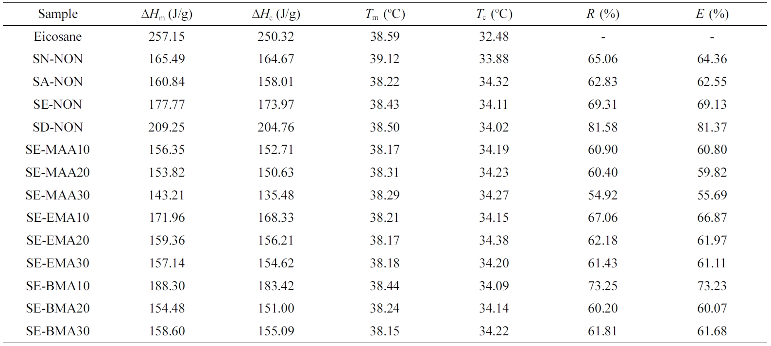 Characterization. Fourier transform infrared (FTIR) spectra of microcapsules were obtained using an ALPHA-P ATR from Bruker. The morphologies of encapsulated particles were observed with JSM-700F SEM from Jeol. The thermal behavior of microcapsules was investigated with samples of around 5 mg under the nitrogen atmosphere at a heating rate of 5 ℃/min with a differential scanning calorimeter (DSC-4000) of Perkin Elmer. In addition, phase-change behavior of microcapsules containing eicosane should be analyzed with two parameters – i.e. encapsulation ratio (R) and encapsulation efficiency (E) –, which can be calculated by the DSC results.13 The R and E values are determined according to eq. (1) and eq. (2), respectively,