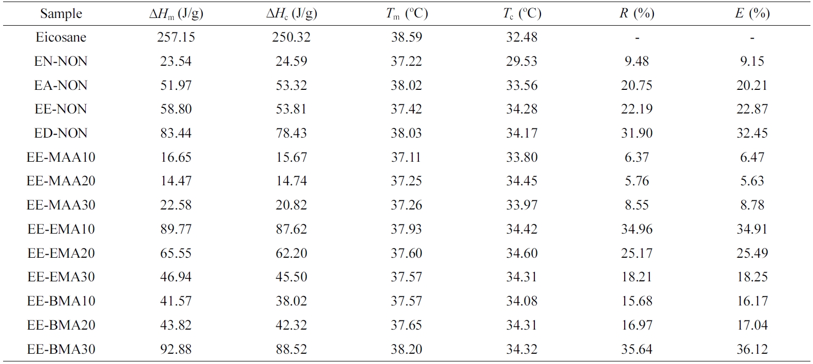 The effect of inputting comonomers on the latent heat of microcapsules was also qualitatively analyzed. In both polymerization methods, the use of MAA as crosslinking agent is thought to be not proper for the encapsulation of paraffins, which is due to the large decrease of encapsulation efficiencies. In comparison with MAA, EMA and BMA are much better in using them as comonomers, which result in higher values of encapsulation efficiencies. Additionally, regardless of the type of comonomers, the increase in the amount of comonomers lowers the encapsulation efficiencies of microcapsules. These phenomena are assumed to be due to the increasing hydrophilicity in the case of MAA and the decreasing hardness in the case of EMA and BMA.16 Through the combining the chemical affinity of comonomers and latent heat capacity of microcapsules, it is estimated that comonomers that have chemical affinity to paraffins and able to form hard molecular chain network in the shell are effective to enhance the encapsulation efficiencies of microcapsules.