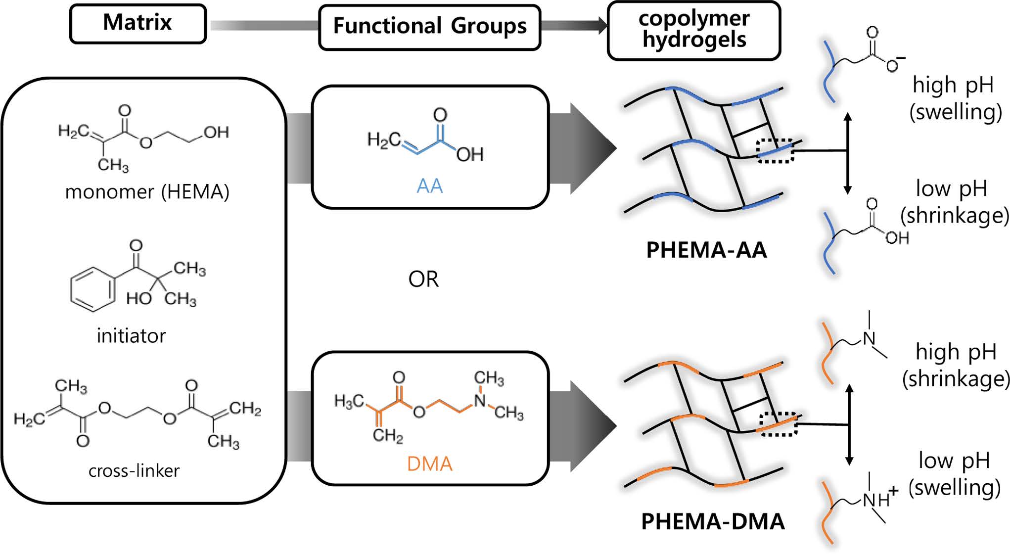 Figure 1은 PHEMA-AA와 PHEMA-DMA 공중합체 하이드로젤을 만드는 과정과 두 공중합체 하이드로젤의 pH 의존팽윤 거동 메커니즘을 보여주는 모식도이다. PHEMA 고분자는 HEMA 단량체, 개시제, 가교제 혼합용액을 광경화 중합하여 제조된다. PHEMA 기반 공중합체 하이드로젤은 이 PHEMA 중합 용액에 AA나 DMA 단량체를 첨가한 후, 광경화 과정을 거쳐서 제조된다. 이 공중합체 하이드로젤은 작용기와 pH 환경에 따라 다른 팽윤 거동을 보여준다. 카복실 작용기를 포함하고 있는 PHEMA-AA 하이드로젤은 높은(염기성) pH 환경에서 수소이온이 떨어져나오면서 음전하를 띠게되고, 그 결과 더 많은 물을 흡수하여 팽윤비가 커지게 된다. 이에 반해, 다이메틸 아민 작용기를 포함하고 있는 PHEMADMA 하이드로젤은 낮은(산성) pH 환경에서 수소이온이 결합하면서 양전하를 띠게 되면서 팽윤비가 커지게 된다. 이와 같은 메커니즘을 바탕으로, 본 연구에서는 PHEMA 기반 하이드로젤에 다른 작용기를 부여함으로써 pH 의존 팽윤 거동 특성 제어가 가능한지에 대한 실험을 수행하였다.