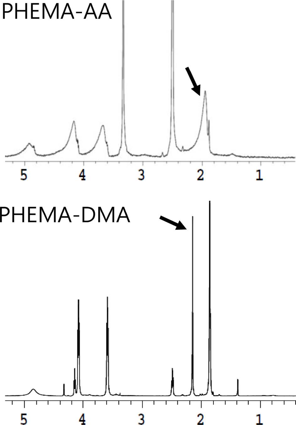 PHEMA에 AA, 또는 DMA가 공중합되었는지 알기 위해, FTIR과 NMR 분석을 하였다. Figure 2는 순수 PHEMA와 PHEMA 복합체의 FTIR 스펙트럼이다. 순수 PHEMA의 스펙트럼과 비교해 볼 때, PHEMA-AA의 경우, 1550 cm-1 부근에서 특이 피크를 관찰할 수 있는데 이는 AA에 있는 -COO-작용기의 비대칭 asymmetric stretching mode에 해당한다.10 PHEMA-DMA의 경우, 2830 cm-1 부근에서 특이 피크를 관찰할 수 있는데 이는 DMA의 –N(CH3)2 작용기에 있는 C-H결합의 stretching에 해당하는 피크이다.11 Figure 3은 PHEMA 복합체의 NMR 분석 결과이다. PHEMA-DMA의 경우 2.1, 3.6, 4.1 ppm에서 특이 피크를 관찰할 수 있다. 2.1 ppm에서의 피크는 DMA의 N(CH3)2 작용기 수소의 특이 피크이며, 3.6, 4.1 ppm 피크는 PHEMA의 옥시에틸렌 그룹의 수소에 해당하는 피크이다.12 각 피크의 상대면적 비로부터 HEMA와 DMA의 몰수비를 유추해보면 대략 5:1이며, 이는 합성 시넣어준 HEMA와 DMA의 몰수 비와 같다. PHEMA-AA의 경우 2 ppm 부근에서 특이 피크를 관찰할 수 있으며, 이는 polymerized AA의 주사슬에 있는 수소에 해당하는 피크이다.13,14 AA의 경우 HEMA와 구조와 비슷하여, 2 ppm 전후영역에서 피크들의 중첩이 일어나므로,15 본 NMR 결과만으로 PHEMA-AA 내 정확한 단량체 중합 비율을 알기는 어려움이 있다. 이상의 FTIR과 NMR 분석을 통해 AA와 DMA가 PHEMA와 성공적으로 공중합되었음을 확인하였다.