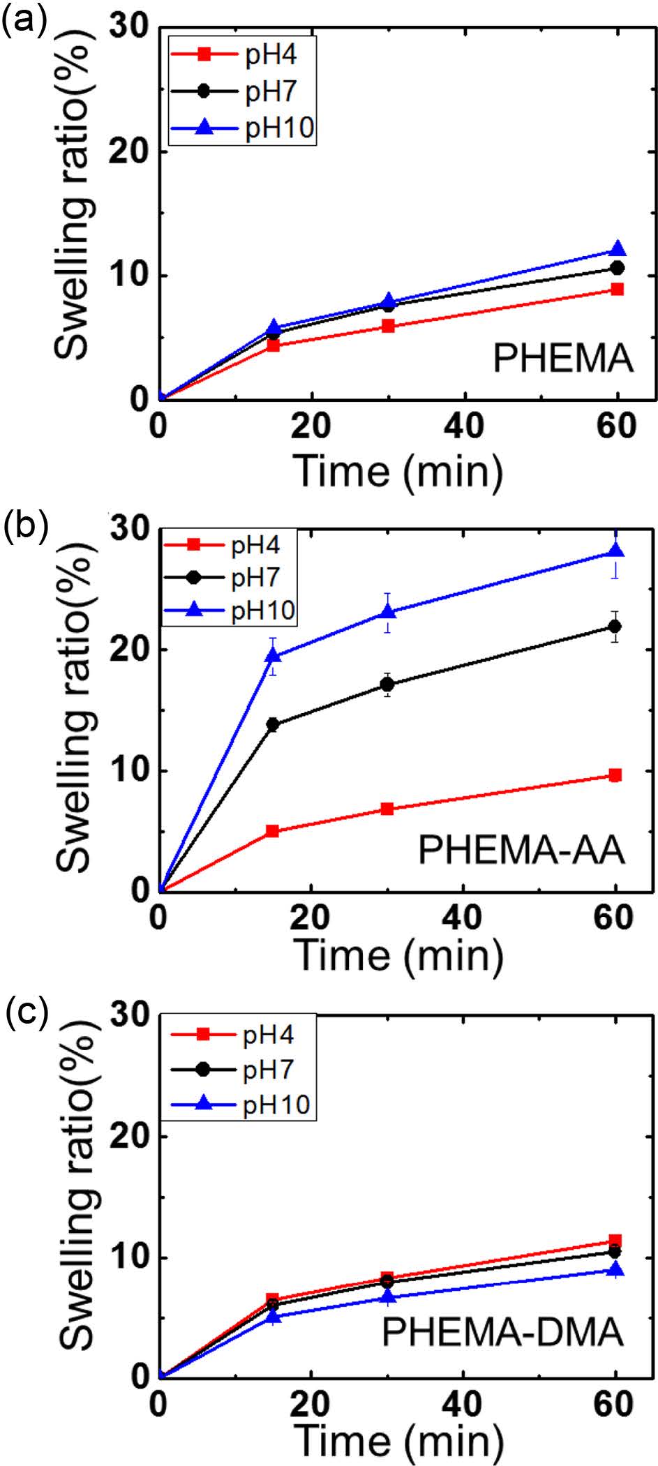 Time-dependent swelling ratios of PHEMA based hydrogels at different pH conditions: (a) pure PHEMA homopolymer hydrogel; (b) PHEMA-AA hydrogel; (c) PHEMA-DMA hydrogel.