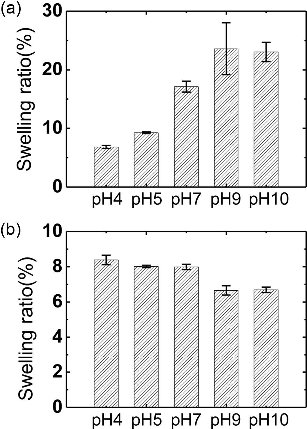 Swelling ratios of PHEMA compolymer hydrogels in different pH conditions between pH 4~10: (a) PHEMA-AA; (b) PHEMA-DMA. The swelling ratios were measured after hydration for 30 min.