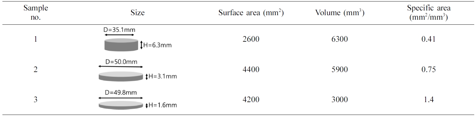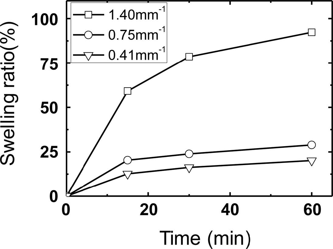 PHEMA 기반 고분자의 팽윤이 일어날 때 수분은 고분자의 표면으로부터 유입되므로, 부피대비 표면적이 팽윤 속도에 영향을 줄 수 있다. 부피대비 표면적이 팽윤 속도에 주는 영향을 알아보기 위해, Table 1과 같이 서로 다른 비표면적을 가진 고분자를 제조하여 시간에 따른 팽윤 거동을 비교하였다. Figure 6은 비표면적이 서로 다른 PHEMA-AA 하이드로젤의 시간에 따른 팽윤비를 보여준다. 하이드로젤의 비표 면적이 클수록 팽윤비가 더 크고 빠르게 진행됨을 알 수 있다. 예를 들어 1시간의 수화과정을 거친 후 팽윤비를 비교하면, 비슷한 부피일 때 비표면적이 0.75일 경우 25% 정도로 0.41인 경우에 비해 약 2배 더 많은 팽윤이 진행된 것을 확인할 수 있었다.
