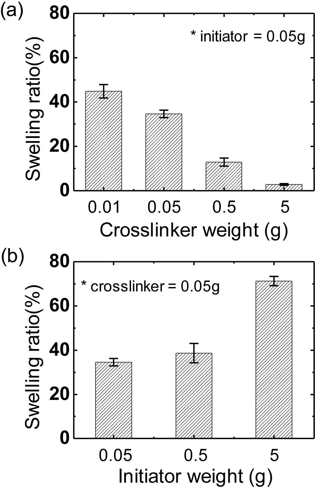 Effect of initiator and crosslinker contents on swelling ratios of PHEMA-AA hydrogels. The hydrogels were swollen in pH 9 condition for 30 min.