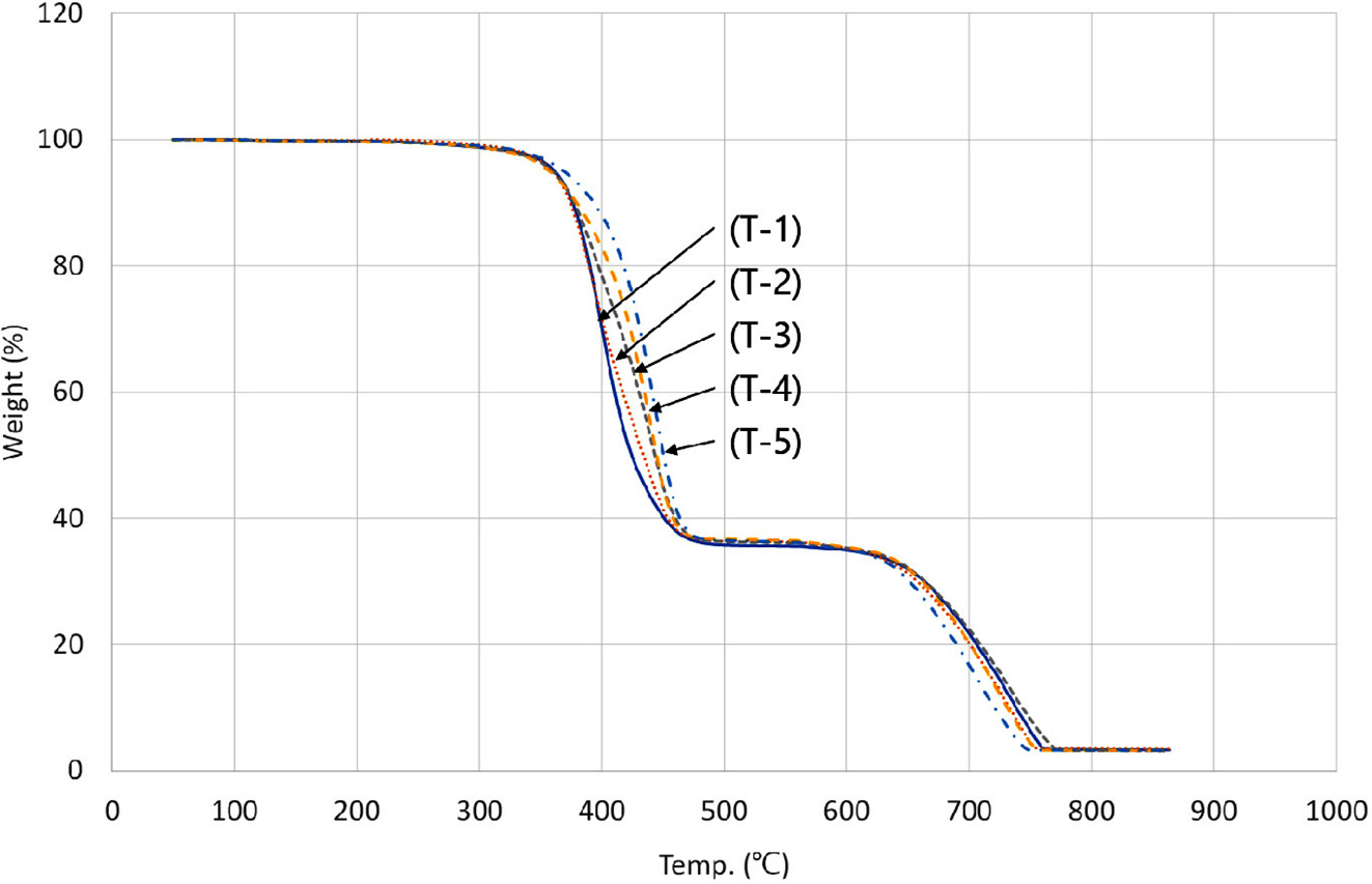 열적 안정성. 10~15 mg의 블렌드 가교체 샘플을 채취하여, Perkin Elmer사 Pyris 1 TGA(thermogravimetric analyzer)를 이용하여 온도에 따른 열 안정성(분해 거동)을 실험하였다. 분석 조건은 질소 분위기에서 승온속도 20 ℃/min로 하여 0~550 ℃까지 1차 분해 후, filler인 카본블랙 분해를 위해 산소 분위기로 전환하여 550~900 ℃까지 분해하였다.