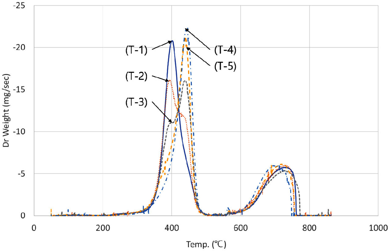 (3) BIIR의 함량이 증가할수록 분해 온도가 증가하여 열적 안정성이 향상되는 것을 확인하였다.