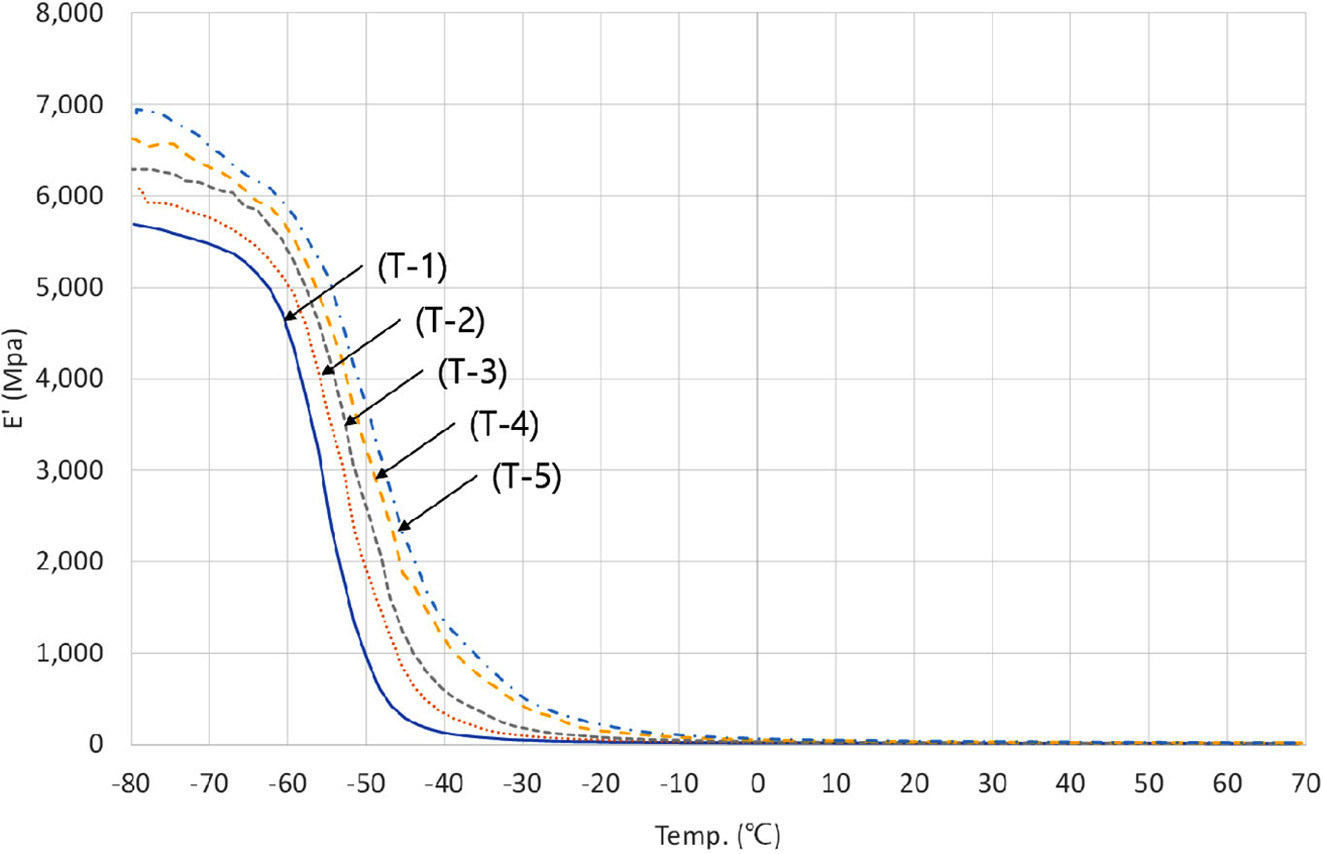 동적·기계적 성질. 동적·기계적 성질인 storage modulus(E'), loss modulus(E'') 그리고 viscoelasticity(tand)는 Gabo사 DMTS(dynamic mechanical thermal spectometer) Eplexor 500 N을 사용하여 시편 가로 5 mm, 세로 15 mm, 두께 2 mm의 시편을 사용하여 동적·기계적 특성을 측정하였으며, 측정은 액체질소를 충전하여 -80 ℃부터 70 ℃까지의 온도범위로 승온속도는 5 ℃/min의 조건으로 10 Hz에서 행하였다.