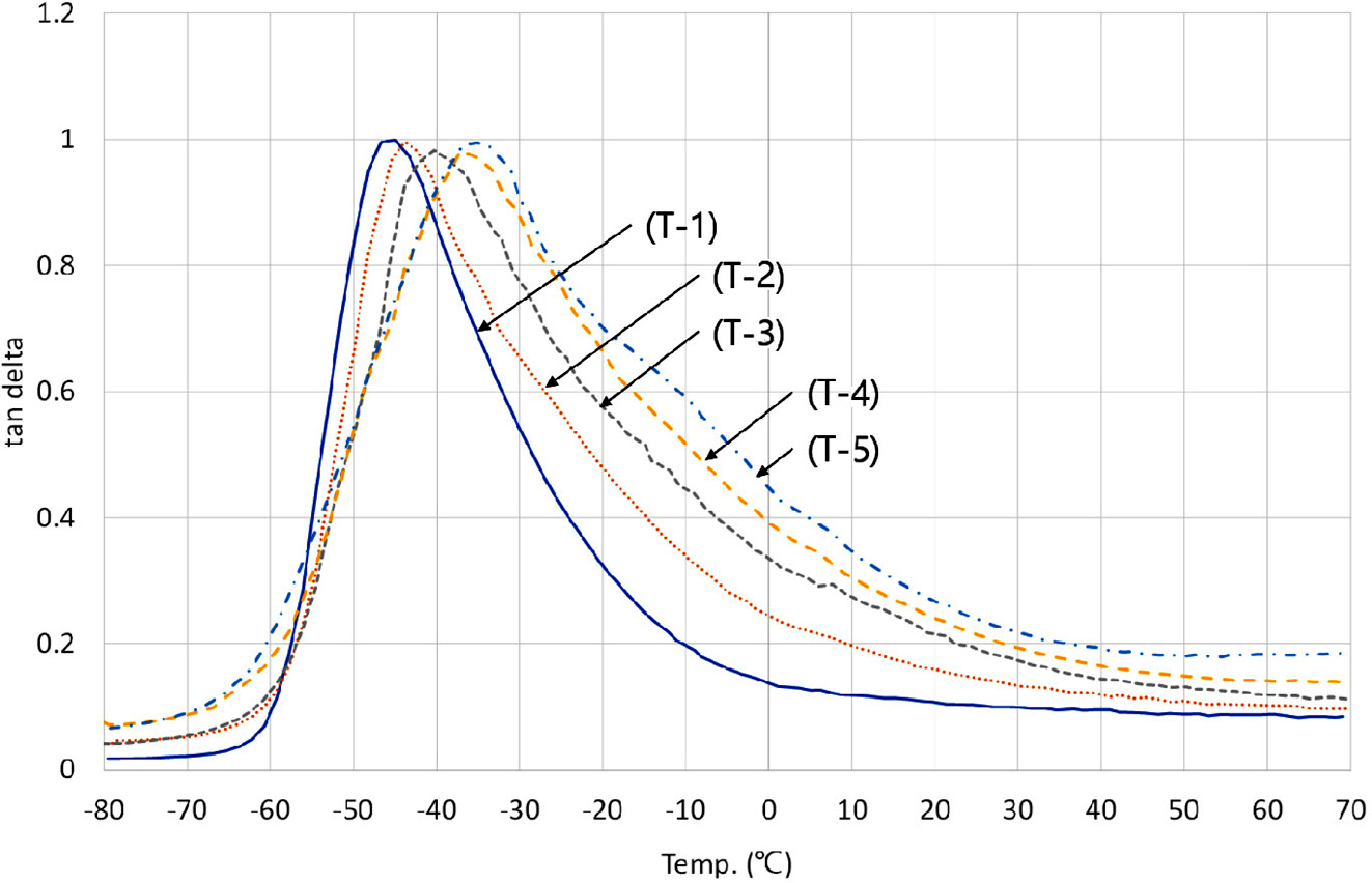 (4) BIIR의 함량이 증가할수록 tand의 피크가 고온 쪽으로 이동하였다.