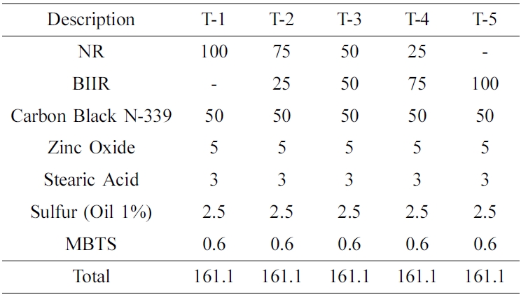 시험편의 제조. 본 실험에서 이용된 시편은 1.6 L의 밀폐식 혼합기 Banbury mixer와 open two roll mill을 이용하여 2단계로 진행하였다. 배합과정은 1차 혼련과 2차 혼련으로 나누어 배합하였으며, Table 1에 도식화하였다. 1차 혼련에서는 가류제와 촉진제를 제외한 모든 재료를 투입하여 master batch 배합고무를 혼합한 후, 2차 혼련에서 가교제와 촉진제를 투입하여 최종 배합물을 얻었다. NR과 BIIR 고무를 초기온도 80 ℃의 Banbury mixer에 투입한 후 30초 정도의 고무 파쇄 단계를 거친 후 필러를 투입하였다. 30초 후에는 나머지 약품을 모두 투입하고 최종온도 150 ℃ 도달 후 배합을 종료하였다. 혼합물은 final batch 혼합을 위해 two open roll mill에서 sheet 형태로 만들었다. 1단계 master batch를 고무사슬이 재배열되고 냉각될 수 있도록 하루의 방치 시간을 가진 후 다시 internal mixer에 가교제와 촉진제를 투입하여 최종 final batch를 만들었다. 배합간 배합물의 온도는 스코치를 방지하기 위하여 95 ℃ 미만으로 유지하였다. 최종 배합물은 시편을 만들기 쉽게 two open roll mill을 통해 3 mm 정도의 두께로 sheet화 하였다. 제조된 NR/BIIR 혼련물의 조성비를 Table 1에 나타내었다. T-1 및 T-5는 각각 NR 및 BIIR 단독으로 하고 T-2, T-3, T-4는 순서대로 NR/BIIR의 비를 75/25, 50/50, 25/75 wt%로 하여 혼련시킨 NR/BIIR 블렌드이다. 최종 배합 시편은 ASTM D 2048에 따라 Rheometer(Alpha ODR 2000)를 이용하여 160 ℃에서 가교도를 평가하였으며, 적정 가교시간(t90)을 산출하여 hot press를 이용한 압축성형법으로 시험시편을 제조한 후 heat build-up, 기체투과도, 열적 성질, 동적·기계적 성질 등의 물성을 측정하였다.