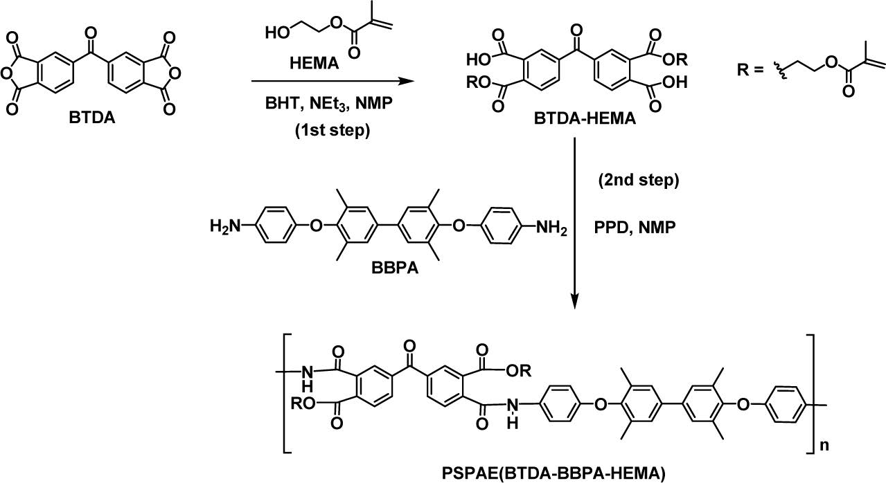 재료. 산이무수물 단량체인 benzophenone-3,3',4,4'-tetracar-boxylic dianhydride(BTDA, Aldrich사)와 디아민 단량체 4,4'-bis(4-aminophenoxy)-3,3',5,5'-tetramethylbiphenyl(BBPA, Danyang E-knock chemical사)는 각각 180과 60 oC의 오븐에서 1일간 건조하여 사용하였다. 2-Hydroxyethyl methacrylate (HEMA, Acros Organics사), 1-methyl-2-pyrrolidone(NMP, Junsei사)를 제외한 dichlorophenyl-phosphine oxide(PPD), triethylamine(TEA), tetraethylene glycol diacrylate(TEGDA,가교제), 2,6-di-tert-butyl-4-methylphenol(BHT, 중합방지제), Irgacure 819(광개시제), cyclopentanone(현상액)과 PGMEA (세정액) 등은 Aldrich사에서 구매하여 추가의 정제없이 사용하였다.