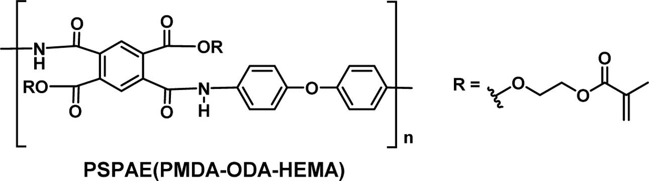 일반적으로 광개시제와 광가교제가 첨가된 PSPAE 용액을 실리콘웨이퍼 기판에 코팅 후 건조하여 제작한 필름 상에 UV를 조사하면 아크릴기의 이중결합간의 가교결합에 의해 광경화되고 유기용제에 대한 용해도가 획기적으로 감소하게 된다. 따라서 PSPAE 필름과 광원 사이에 패터닝된 마스크를 놓고 UV를 조사하면 PSPAE 필름에 패턴이 형성된다. 이 필름을 유기용제로 처리하면 미경화부는 용해되어 제거되고 경화부만 남아서 마스크와 동일한 패턴 모양을 갖는 PSPAE 필름을 제작할 수 있다. 이와 같이 패터닝된 PSPAE 필름은 350-400 oC에서 1시간 이상 열처리 공정 과정에서 광경화기가 열분해로 제거되면서 이미드화되어 패턴을 갖는 폴리이미드(PI) 필름으로 전환된다.4