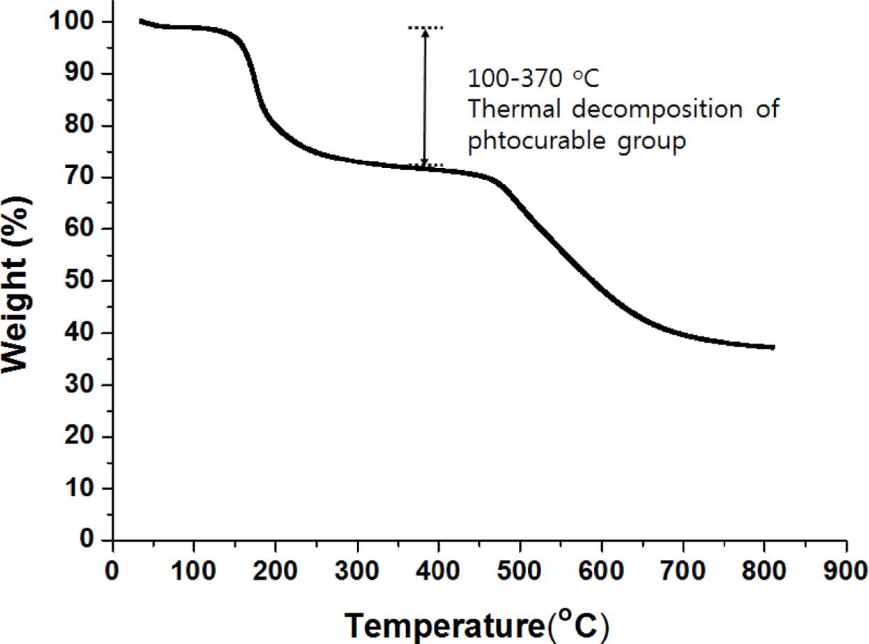 한편, Figure 4는 PSPAE(PMDA-ODA-HEMA)의 주사슬 단량체인 PMDA와 ODA보다 분자량이 큰 BTDA와 BBPA를 사용하여 합성한 PSPAE(BTDA-BBPA-HEMA)의 질소분위기 하에서 열중량 거동을 고찰한 TGA 곡선이다. 100 oC 이하에서 약 0.8%의 중량 감소는 수분에 의한 것이다. 100-370 oC에서 광경화기의 열분해에 의해 28%의 중량감소가 관찰되는데 이는 이미드화에 의한 이론적 중량감소율(26%)과 상당히 일치하고 있다. 고분자 주사슬의 열분해는 450oC 이상에서 일어남을 알 수 있으며 800 oC의 고온에서도 전체 중량의 38% 정도는 잔존하는 것을 확인하였다. 즉, 분자량이 큰 단량체를 사용함으로써 광경화기의 열분해에 의한 중량감소 완화 및 이미드의 내열성 향상이 가능함을 확인하였다.
