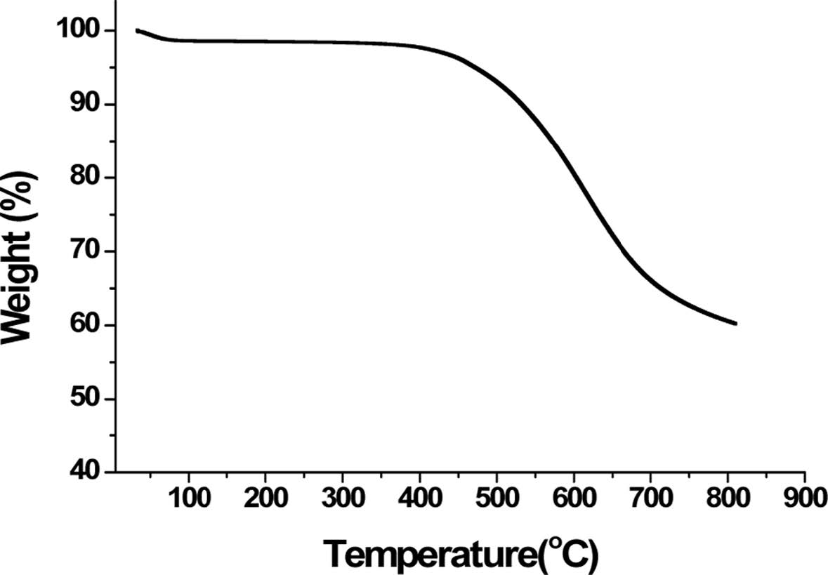 Figure 6 TGA curve of polyimide film(PI-F1) after imidization with a heating rate of 10 oC/min in nitrogen. |