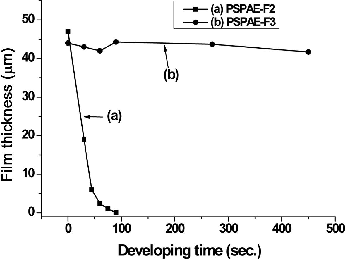 용해속도(Dissolution Rate). PSPAE 조성물의 광패턴 공정 중에 현상액으로 처리하는 시간을 최적화하기 위하여 SOB 후 약 40 μm 두께의 필름 시료 2 종을 제조하였다. UV 조사를 하지 않은 필름 시료(PSPAE-F2)와 UV(400 mJ/cm2)를 조사한 필름 시료(PSPAE-F3)를 모두 동일하게 110 oC에서 PEB를 실시한 후에 현상액으로 처리하여 시간별로 필름두께 변화(Figure 7)를 관찰하였다. UV 조사를 하지 않은 필름 시료(PSPAE-F2)는 현상액에 녹아서 30초 후에는 초기 두께의 40% 정도만 남아 있었고 90초 후에는 완전히 제거되었다(Figure 7(a)). UV를 조사한 필름 시료(PSPAE-F3)는 광경화되어 현상용액에 대해서 450초까지 안정적으로 두께를 유지하였다(Figure 7(b)). 이 결과를 바탕으로 실제 패턴 공정 시에는 현상 시간을 360초로 설정하였다.