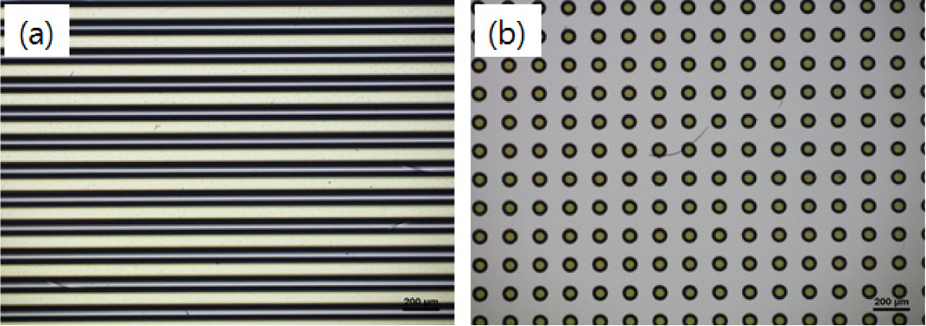 광패턴. 네가티브 PSPAE 조성물을 이용하여 열경화 후 20 μm 이상의 필름 두께 달성을 목표로 1500 rpm으로 스핀코팅하고 SOB하여 제조한 필름의 광패턴을 실시하였다. 100, 60, 40, 20 μm의 선폭을 갖는 line과 dot 모양의 패턴을 형성할 수 있는 포토마스크를 통하여 400 mJ/cm2 의 UV를 조사한 후, 110 oC에서 3분간 열처리(PEB)를 차례로 진행하였다. Cyclopentanone에서 360초 현상하고 PGMEA로 세정한 후 건조된 필름을 광학현미경으로 관찰하였다. 60 μm 선폭의 line 패턴(Figure 8(a))과 60 μm의 지름을 갖는 dot 패턴(Figure 8(b))을 성공적으로 제작할 수 있었다. 그 이하의 선폭과 지름을 가지는 패턴의 경우에는 현상과 세정 후에도 미경화부가 완전히 제거되지 않고 남아있었다. 이 문제는 공정 최적화를 통해 해결이 가능할 것이다.