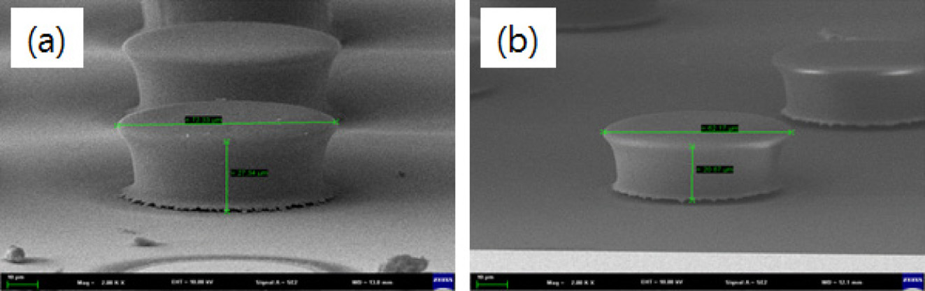 PSPAE 조성물; 패턴 및 경화 후 수축율, SEM. Figure 9의 SEM 사진 중 Figure 9(a)는 Figure 8(b)의 dot 패턴(열경화 전)을 관찰한 것이고 Figure 9(b)는 Figure 8(b)의 dot 패턴을 350 oC 진공오븐에서 1시간 열경화시킨 후에 얻은 PI dot 패턴을 관찰한 것이다. 열경화 전에 패턴의 두께는 약 27 μm로 측정되었고 열경화 후에는 패턴의 두께가 약 20 μm로 줄어들었다. 두께 수축률은 약 25%였다. 이 수축률(25%)은 PSPAE(BTDA-BBPA-HEMA)의 TGA 곡선에서 관찰한 중량 감소값(28%)과 패턴형성 전의 PSPAE(BTDA-BBPA-HEMA) 필름을 연속해서 열경화한 후에 관찰한 두께 감소율(28%)과 유사한 값이다. 본 연구에서 개발한 네가티브형 PSPAE 조성물은 이미드화 공정 후에 기존 제품보다 필름 두께 감소율이 낮아서 300 oC 이상의 고온 공정을 견디며 높은 두께의 패턴이 요구되는 적층형 소자의 절연층으로 사용하기에 적합하다.